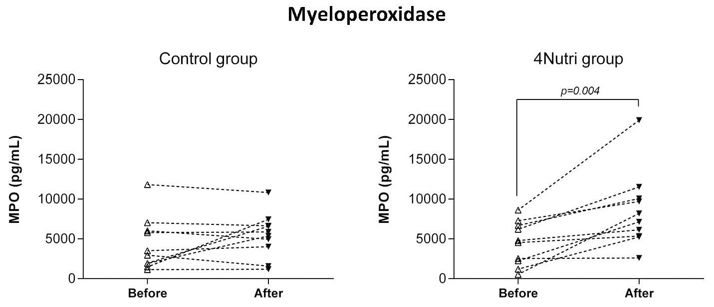Fig. 3.Effects of regular (Control group) and enriched hen eggs (4Nutri group) consumption on the serum levels of MPO after three-week diet protocol. Paired t-test; significance level p