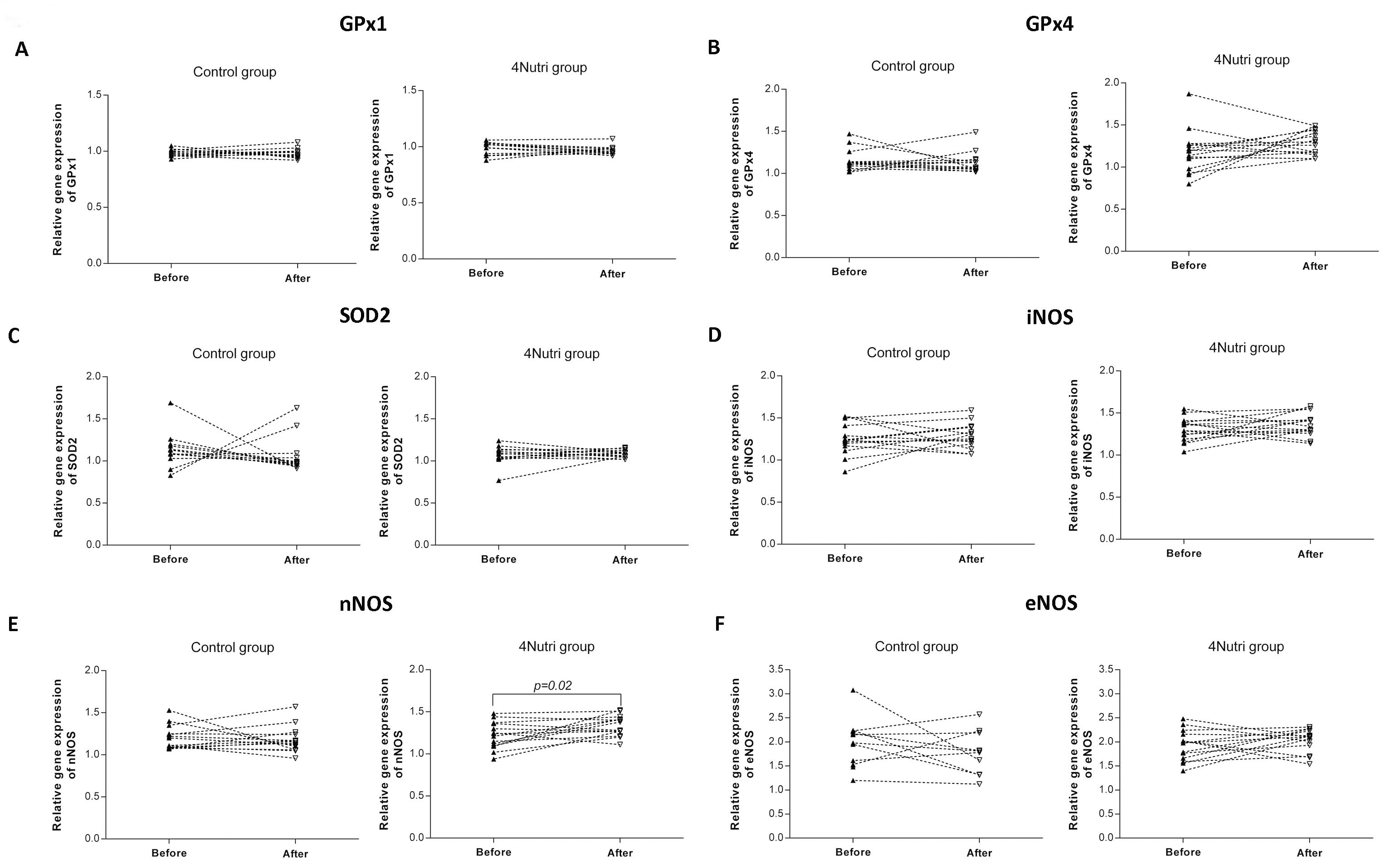 Fig. 4.Effects of regular (Control group) and enriched hen eggs (4Nutri group) consumption on relative gene expression of GPx1 (A), GPx4 (B), SOD2 (C), iNOS (D), nNOS (E) and eNOS (F) in PBMCs after three-week diet protocol. GPx, glutathione peroxidase; SOD, superoxide dismutase; iNOS, inducible nitric oxide synthase; nNOS, neural nitric oxide synthase; eNOS, endothelial nitric oxide synthase. Paired t-test; significance level p