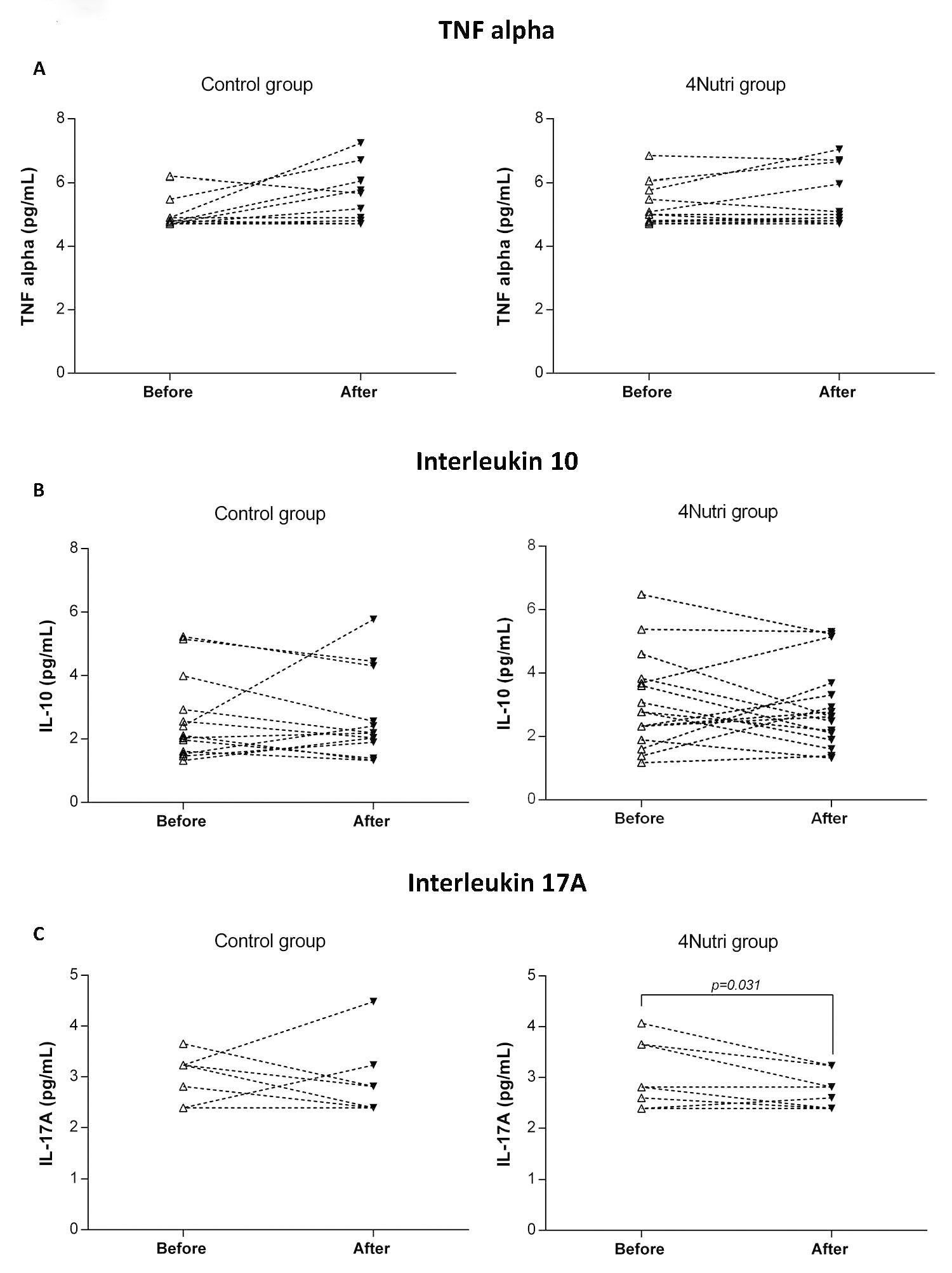 Serum concentrations of pro- and anti-inflammatory cytokines (IL-17A, IL-10) and tumour necrosis factor-alpha in the control and 4Nutri group, before and after dietary protocols, are presented in Fig. 5. There were no significant changes of IL-10 or TNF-