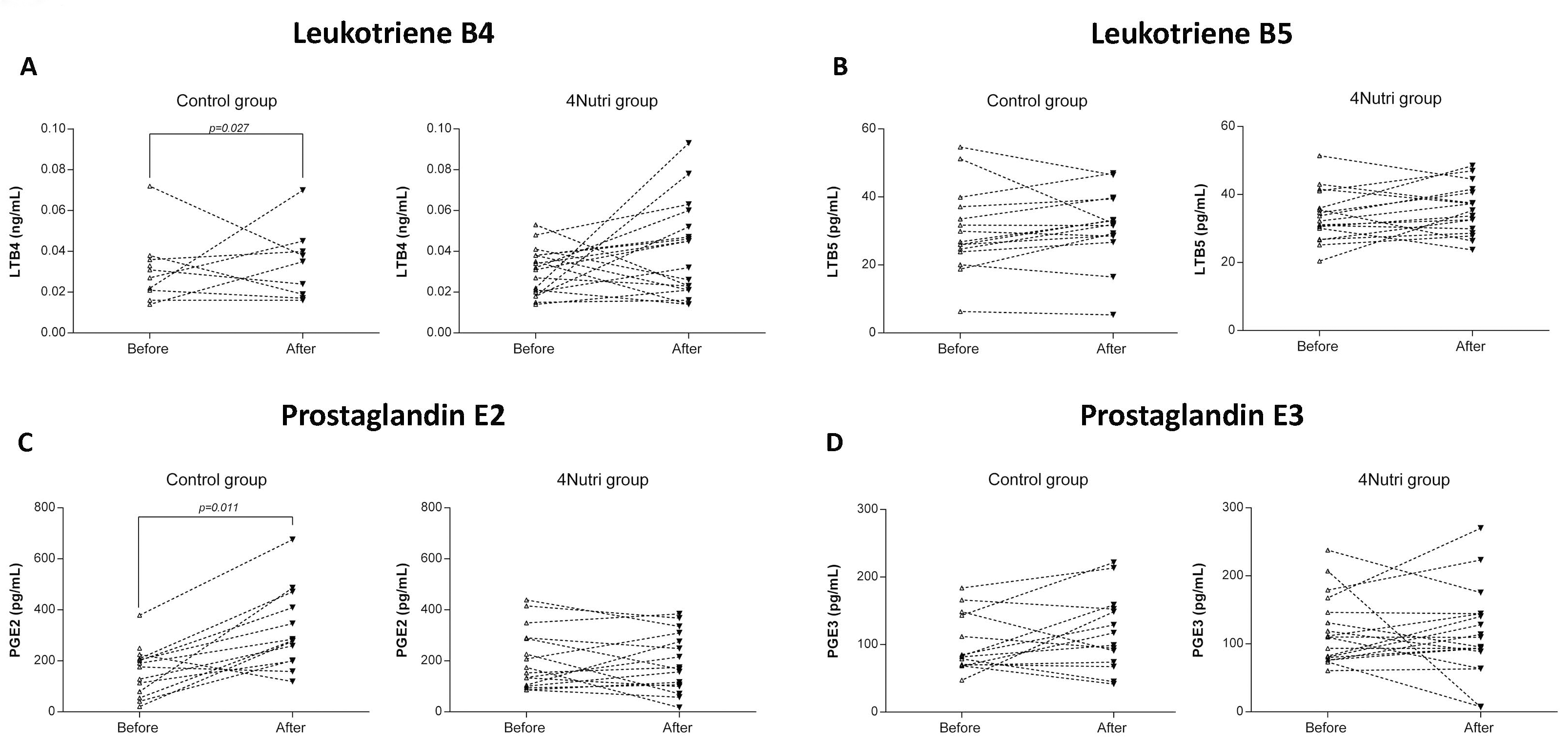 Fig. 6.Effects of regular (Control group) and enriched hen eggs (4Nutri group) consumption on the serum concentrations of lipid mediators LTB4 (A), LTB5 (B), PGE2 (C) and PGE3 (D), after respective dietary protocols. LTB4, leukotriene B4; LTB5, leukotriene B5; PGE2, prostaglandin E2; PG E3, prostaglandin E3. Paired t-test; significance level p