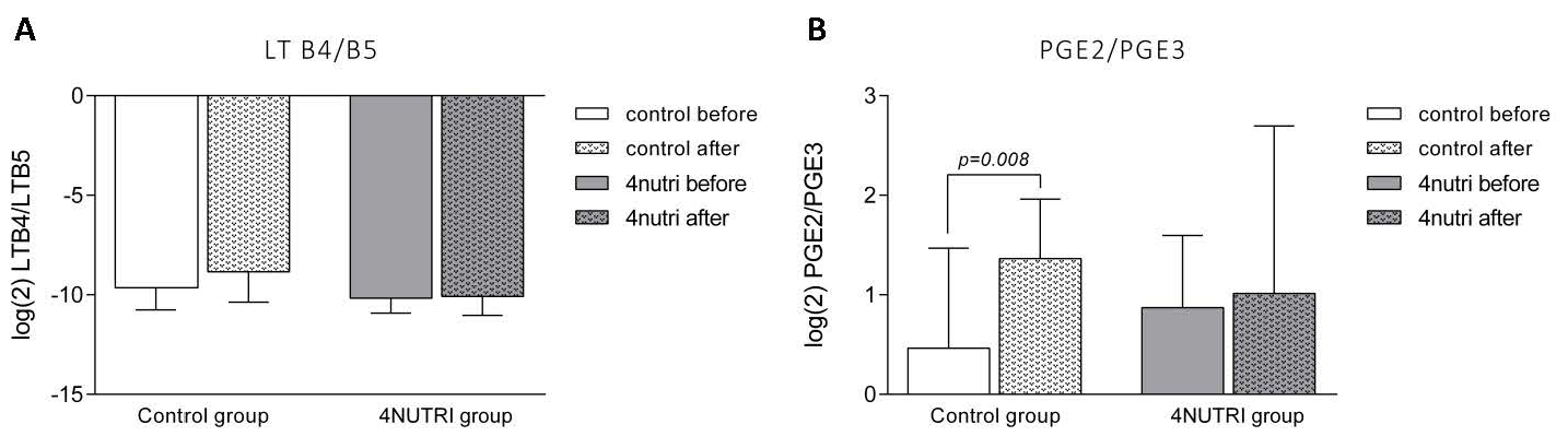 Fig. 7.Effects of regular (Control group) and enriched hen eggs (4Nutri group) consumption on leukotriene B4/B5 (A) and prostaglandin E2/E3 (B) serum ratio after respective dietary protocols. LTB4, leukotriene B4; LTB5, leukotriene B5; PGE2, prostaglandin E2; PGE3, prostaglandin E3. Paired t-test; significance level p