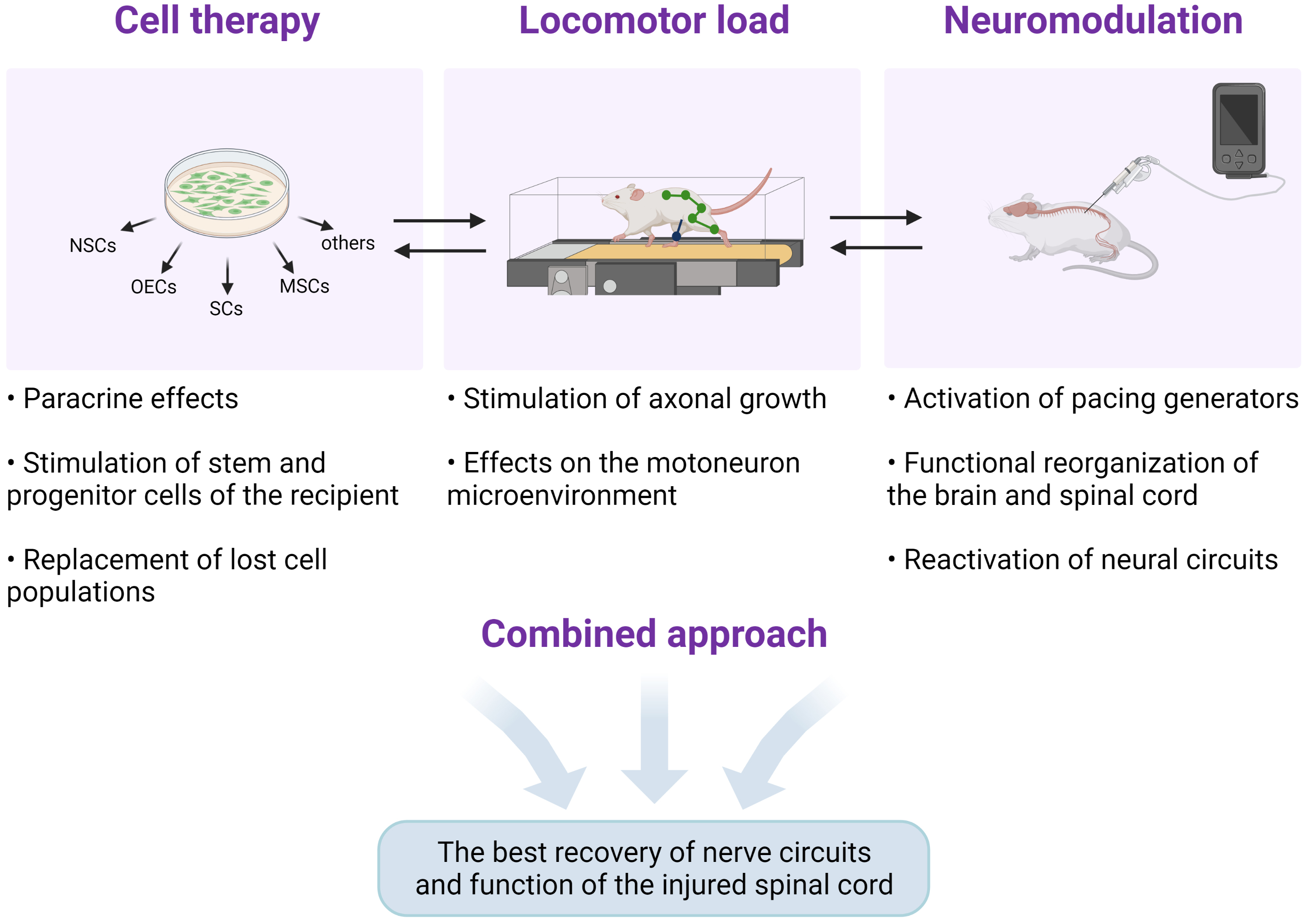 Neuromodulation-activated spinal neural networks require the support of cellular transplants in order to achieve further reconstruction and repair of damaged nerve tissue. Hence, the use of combined approaches based on electrostimulation and cell transplantation can enhance the therapeutic effect, while the inclusion of locomotor load can help to consolidate the restorative effect.