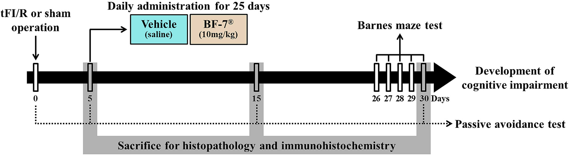 However, to the best of our knowledge, it has been poorly reported whether therapeutic administration of BF-7® for a long time after hippocampal neuronal loss following tFI/R improves IRI-induced cognitive impairment. Therefore, the aim of this study was to examine whether BF-7® therapy can improve tFI/R-induced cognitive impairment in gerbils. Moreover, we investigated the effects of BF-7® therapy on remyelination and restoration of neurotransmission in the hippocampus with tFI/R injury.