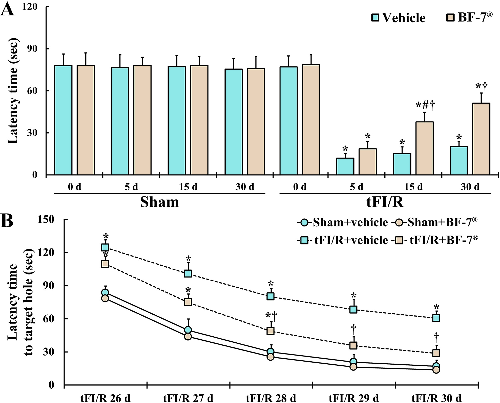 As shown in Fig. 2B, latency time in all groups to find the target hole measured from 26 days to 30 days after tFI/R was gradually shortened (Fig. 2B). Latency time was not significantly different between the two sham groups (Fig. 2B). In the tFI+vehicle group, latency time was significantly longer than that in the sham groups (Fig. 2B). In the tFI+BF-7® group, latency time was also longer than that in the sham groups, but the latency time measured at 28, 29 and 30 days after tFI/R was significantly shortened when compared with that in the tFI+vehicle group R (Fig. 2B).