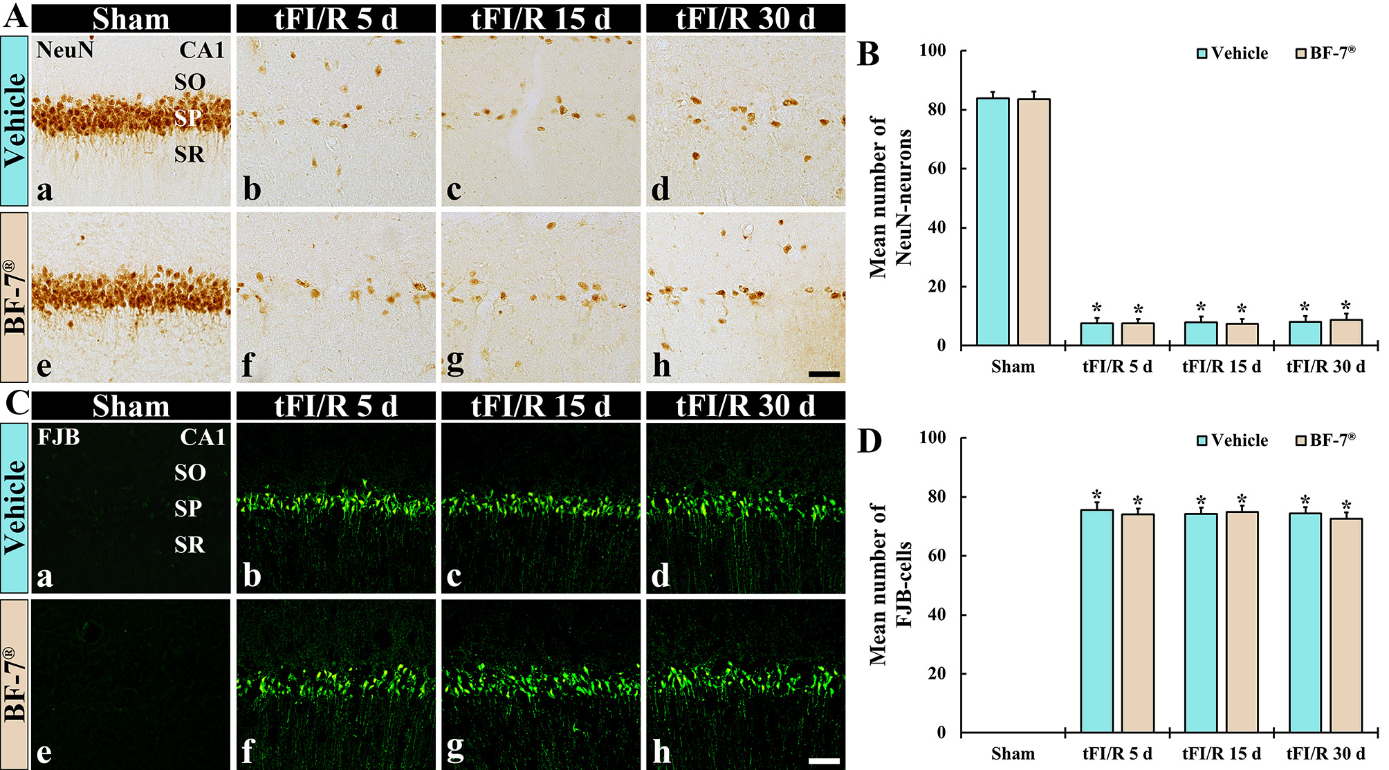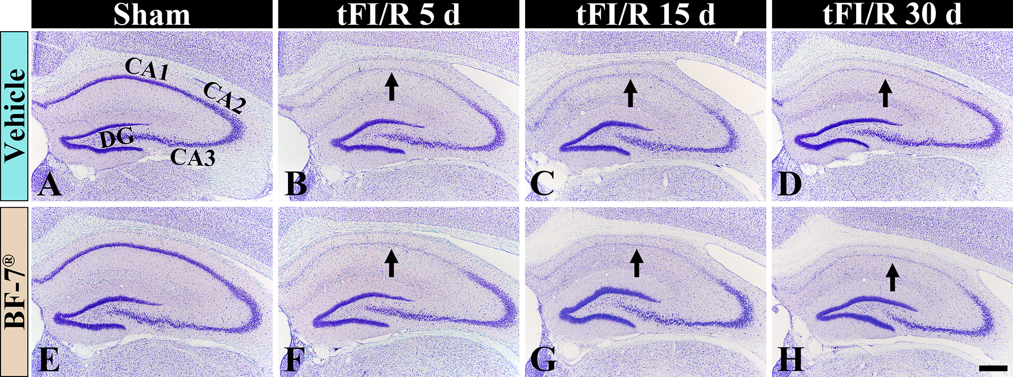 Based on the results of NeuN immunohistochemistry and FJB histofluorescence, the administration of BF-7® did not affect tFI/R-induced neuronal death in the hippocampal CA1 field.