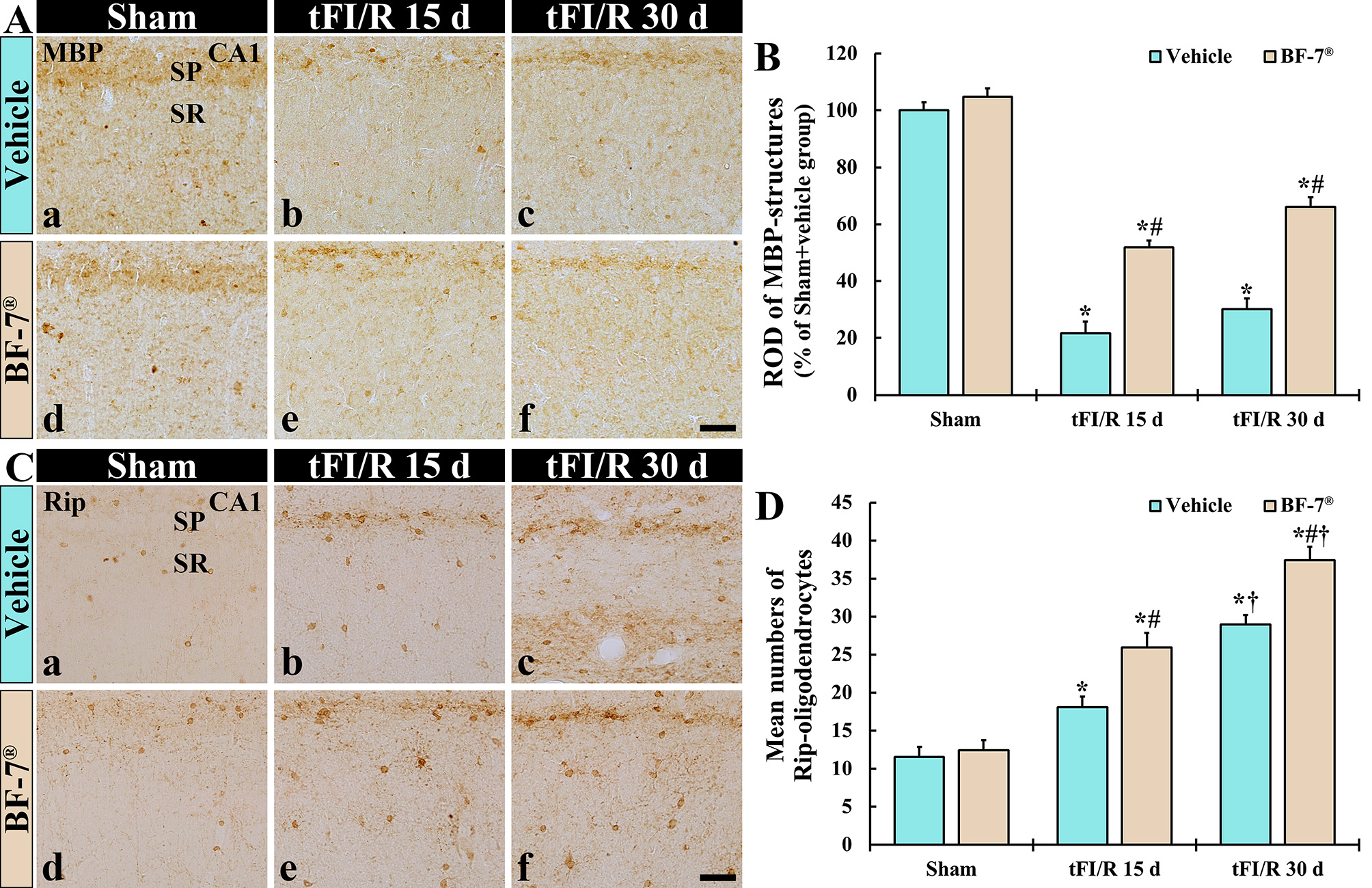 In both sham groups, MBP-structures, which covers axons, were distributed throughout all layers in the CA1 field (Fig. 5Aa,Ad). In the tFI+vehicle group, the density of MBP-structures was significantly decreased when compared with that in the sham+vehicle group (ROD: about 22% at 15 days and about 30% at 30 days after tFI/R versus sham+vehicle group) (Fig. 5Ab,Ac,B). However, in the tFI/R+BF-7® group, the density of MBP-structures was significantly increased when compared with that assessed in the corresponding time tFI/R+vehicle group (ROD: about 52% at 15 days and about 66% at 30 days after tFI/R versus sham+vehicle group) (Fig. 5Ae,Af,B).