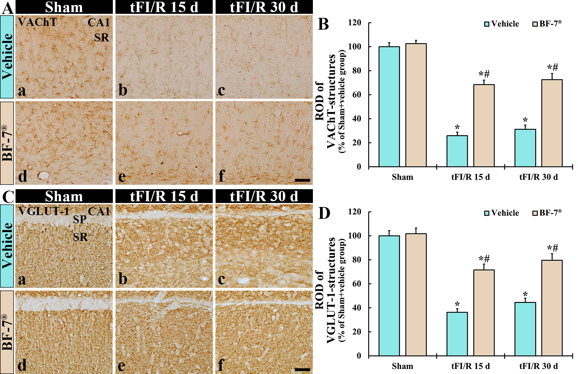 In both sham groups, VAChT-structures (responsible for loading acetylcholine into secretory organelles in neurons) were fundamentally observed in all layers of the CA1 field (Fig. 6Aa,Ad). In the tFI/R+vehicle group, VAChT-structures were significantly reduced when compared with those of the sham+vehicle group (ROD: about 26% at 15 days and about 31% at 30 days after tFI/R versus sham+vehicle group) (Fig. 6Ab,Ac,B). On the other hand, in the tFI/R+BF-7® group, VAChT-structures were significantly increased when compared with those measured in the corresponding time tFI/R+vehicle group (ROD: about 68% at 15 days and about 73% at 30 days after tFI/R versus sham+vehicle group) (Fig. 6Ae,Af,B).