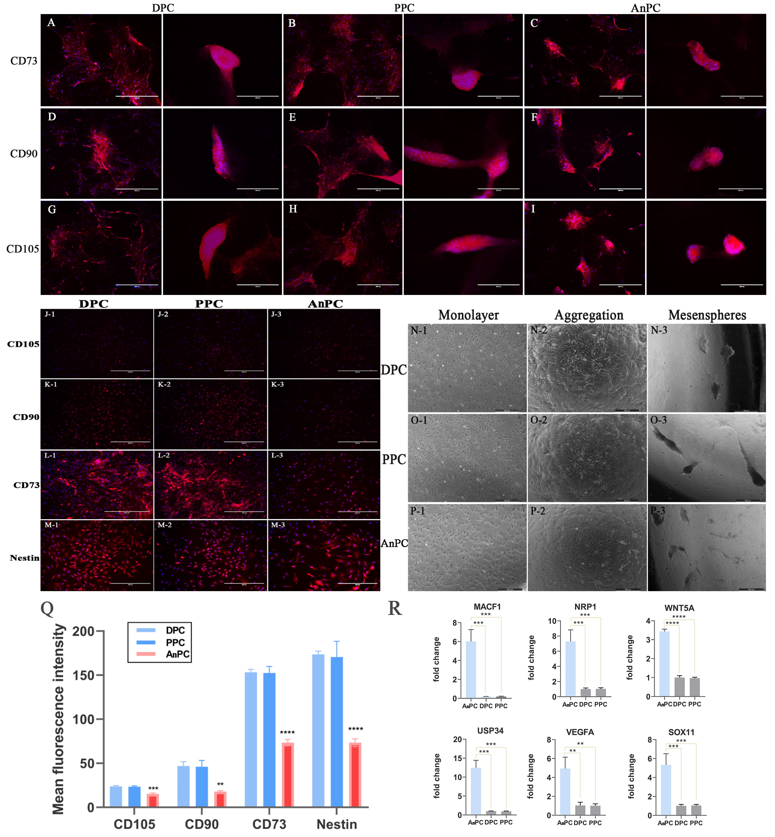 To evaluate the characteristics of AnPC, the classical mesenchymal stem cell (MSC) markers expressed by cultured PPSC [23] were used in this study. The results showed AnPC were also positive to CD105, CD90, and CD73, consistent with DPC and PPC (Fig. 2J–L). However, compared to the strong expression of the MSC markers on PPSC, the fluorescence intensities of all MSC markers on AnPC were significantly weaker (Fig. 2Q). The percentage of the positive cells of AnPC were also significantly lower than that of DPC or PPC (Supplementary Table 3). Note that there was no significant expression difference of the three markers between DPC and PPC. In addition, we detected all AnPC, DPC and PPC with nestin expression (Fig. 2M1–3) and mesensphere-forming capability (Fig. 2N1–3, O1–3, P1–3), which were typical phenotypes of the neural-crest-derived stem cells [47, 48, 49, 50, 51, 52]. Therefore, the AnPC, PPC and DPC likely shared the same neural crest origin. Interestingly, we also found the fluorescence intensities of all the MSC markers on DPC, PPC and AnPC gradually increased as the mesenspheres clustered from the monolayer cells (Fig. 2A–I). The expressions of CD73, CD90 and CD105 all became strengthened as DPC, PPC, and APC aggregated into clusters (Fig. 2A–I left panels) and reached highest when mesenspheres formed (Fig. 2A–I right panels). Fig. 2N–P show the steps of the DPC, PPC and APC mesensphere formation from the monolayer DPC, PPC and APC when the culture medium was changed from DMEM/FBS to serum-free MSC medium.