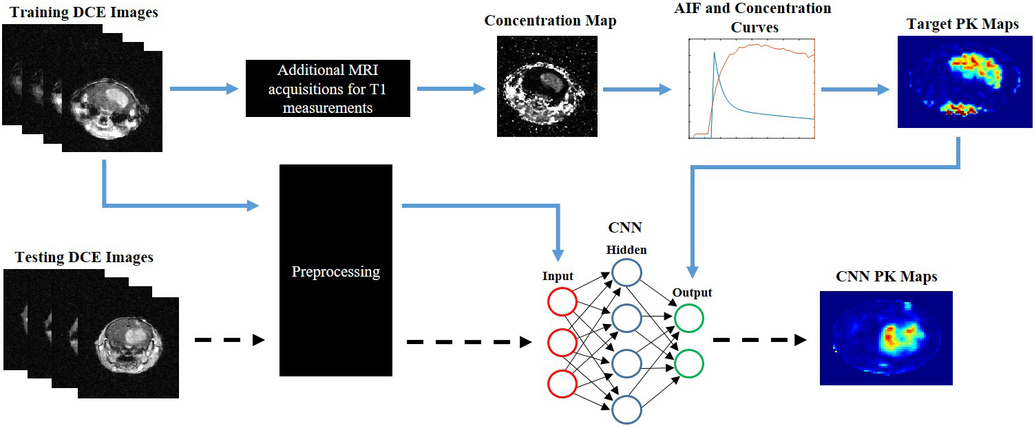 To address these limitations, we are seeking a machine learning approach for faster DCE parameter estimation without human bias. Machine learning has been increasingly used to power various research areas as it provides us with the ability to augment the knowledge and efforts of experts with a tool that can help to analyze data, and consequently make better predictions and decisions. Machine learning is commonly divided into two general forms, unsupervised and supervised learning. Unsupervised learning is concerned with understanding the internal structures of unlabeled data in a fully automated manner. Supervised learning requires training data to be manually labeled, where the algorithm learns from the labeled training data to predict the correct label for the unlabeled test data [22]. The model developed in this study is a supervised deep learning algorithm. Compared to the conventional machine learning methods, which require considerable research and design effort to capture higher-level features of the data, deep learning models learn data representations at various levels of abstraction automatically [23, 24]. One such advanced deep learning algorithm used for images is the convolutional neural network (CNN).