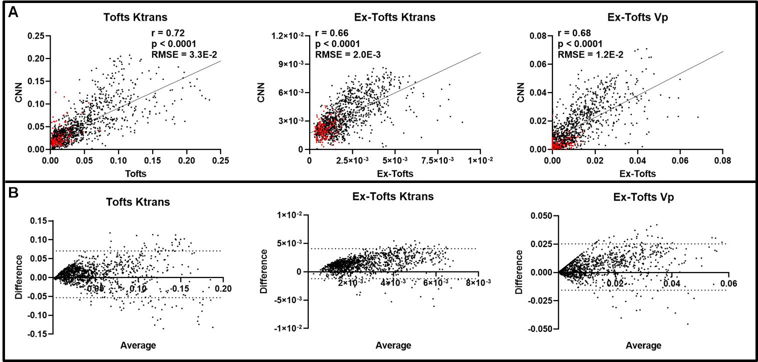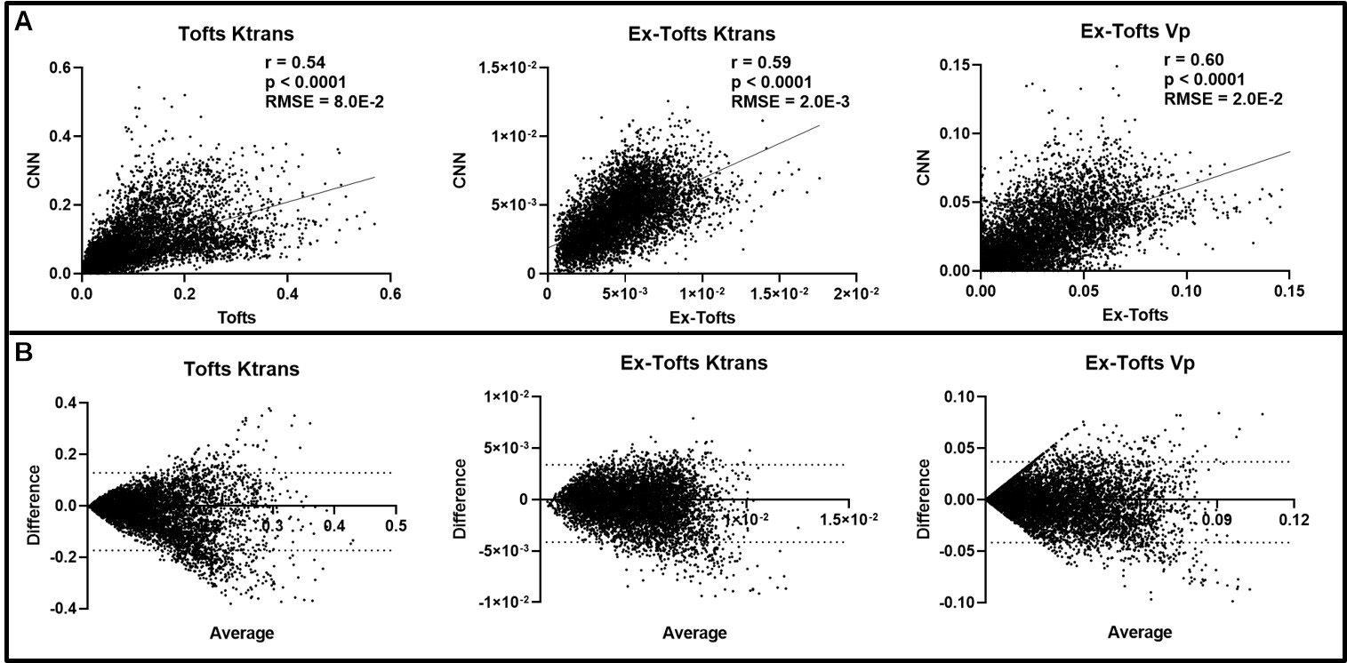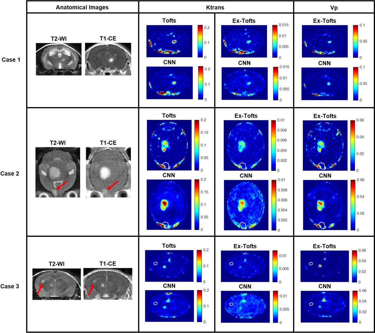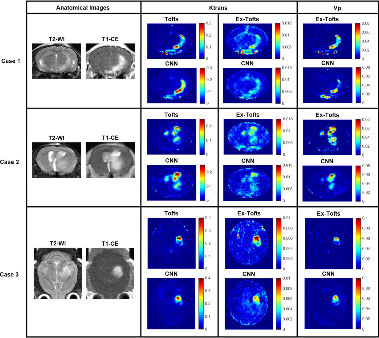 In summary, we have successfully deployed the Tofts model and the Ex-Tofts model as well as a deep learning-based CNN to study vascular permeability in small animal brain tumors. Results and observations from the CNN infer that this deep learning approach could perform as precisely as the conventional PK models. Importantly, the CNN approach requires limited data without human intervention and can be completed with much less time. Future studies by training and testing the system with more data and including additional glioma models with differential phenotypes of tumor aggressiveness and angiogenesis will be needed to further establish its utility. Furthermore, implementation of an accurate AIF measurement in these small animals in a case-by-case basis prior to CNN training might enhance the accuracy of the produced conventional PK and CNN maps by taking into account individual variation. We anticipate that the proposed deep learning-based CNN will serve as a useful surrogate for small animal brain tumor research of vascular PK parameters.
