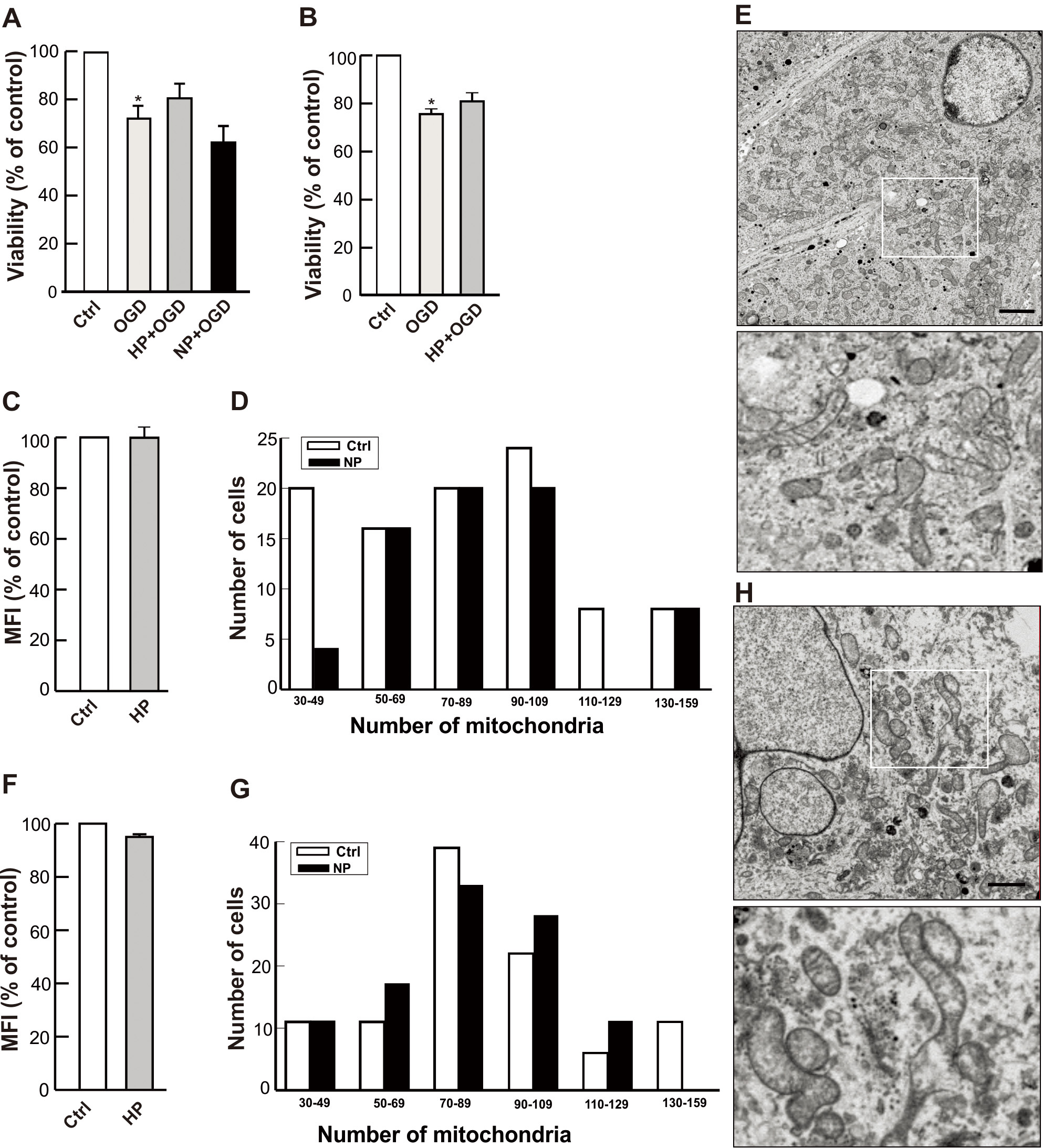 The effects of the preconditioning treatments with hypoxia and NO were also tested in the primary cultures of mouse cortical neurons and the results showed no difference in the mitochondrial mass and neuroprotection against OGD between preconditioned and control cell cultures (Fig. 9). Thus, the above results obtained with differentiated and cultured rat and human neuronal cells in vitro, are consistent with the phenomenon observed in the primary culture of mouse cortical neurons in vivo.