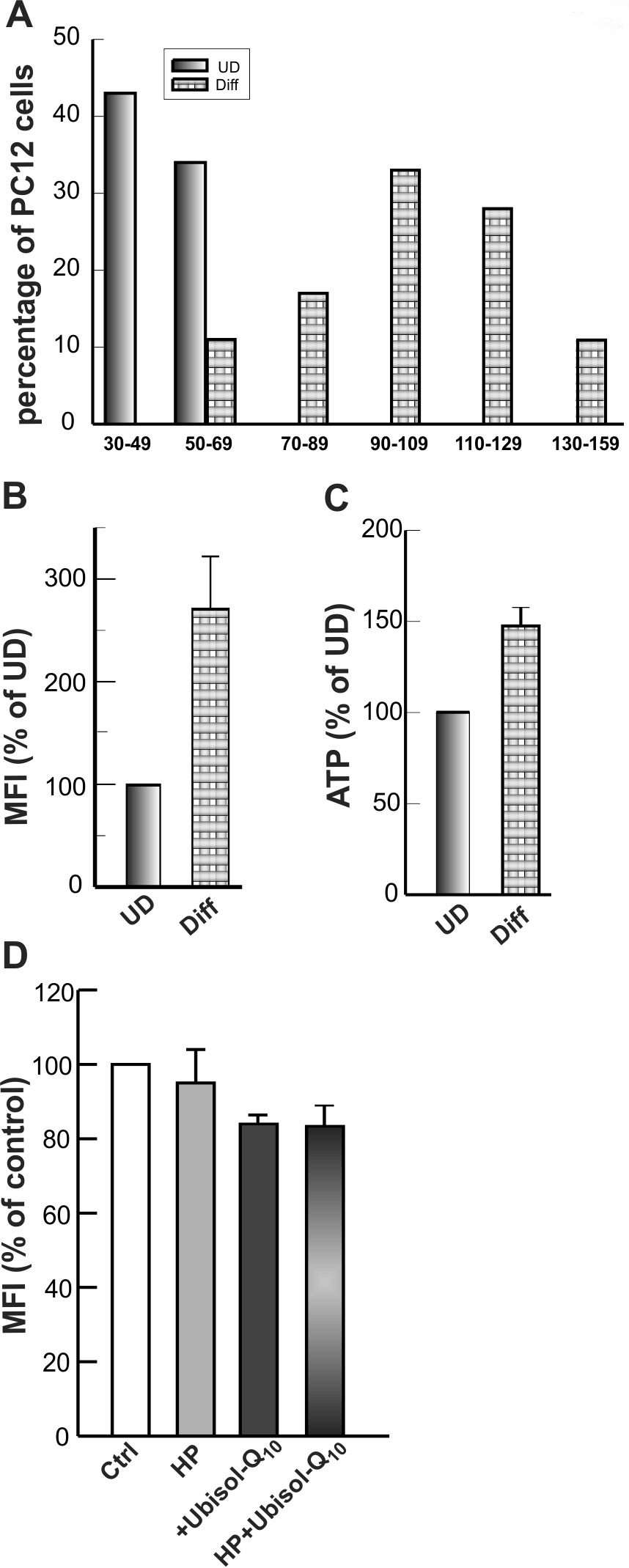 Fig. 8.Mitochondrial content, energy status during differentiation of PC12 cells. (A) Undifferentiated and differentiated PC12 cells were fixed, stained, embedded, and sectioned for electron microscopy as described in Materials and Methods. TEM images of cells were digitally captured on a JEOL 1230 electron microscope, and the number of mitochondria per cell slice was determined for cells with similar cytoplasmic volumes. (B) The fluorescence intensity of NAO was analyzed by flow cytometry for undifferentiated (UD) and differentiated (Diff) PC12 cells. (C) Basal ATP levels were measured by the luciferase assay for UD and Diff-PC12 cells. (D) Differentiated PC12 cells were hypoxia preconditioned in the presence or absence of antioxidants and mitochondrial mass was determined by staining with NAO and analysis by flow cytometry. Bars show the percent increase in the mean fluorescence intensity (MFI) values over control cells from three separate experiments.