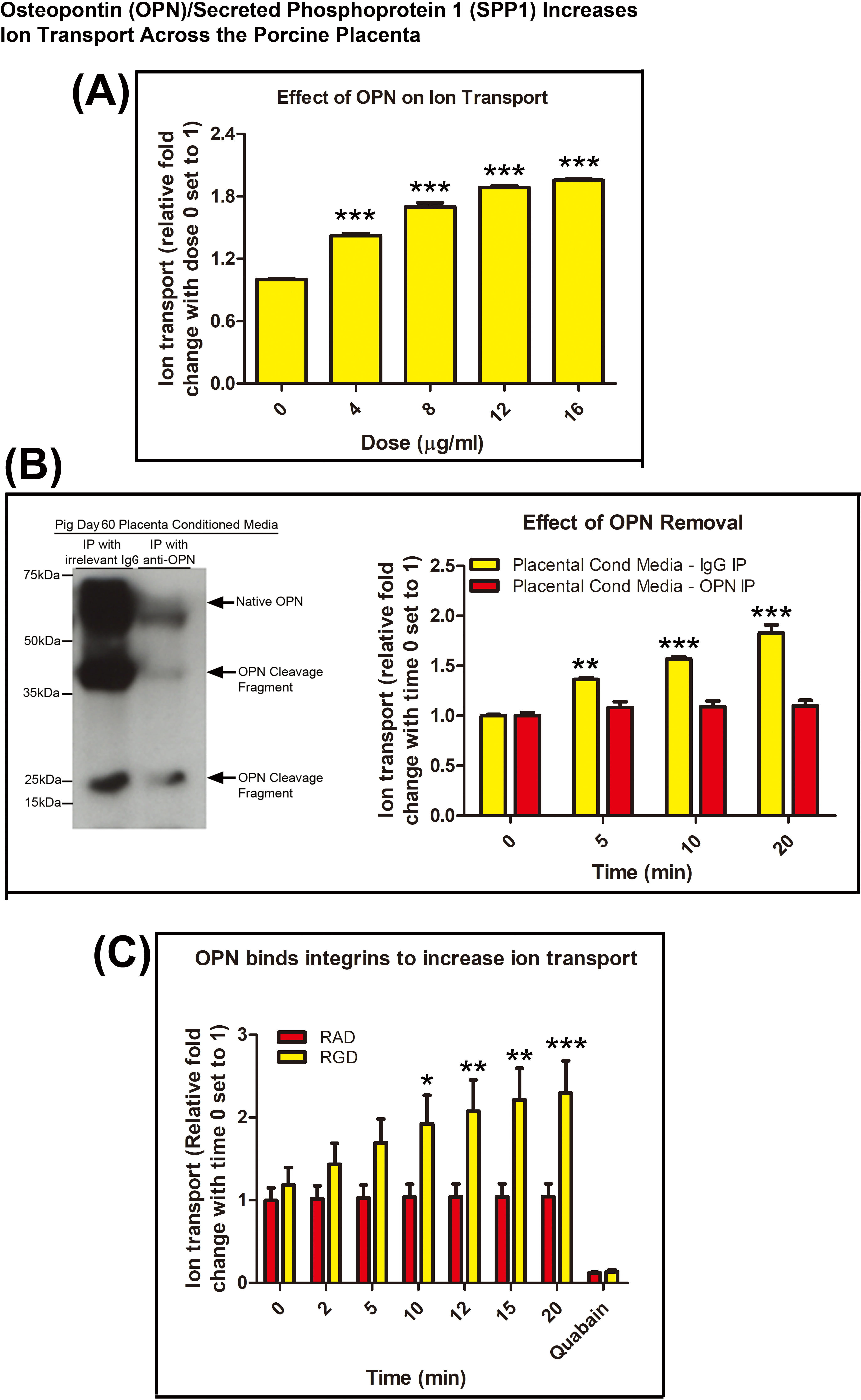 Prevailing dogma asserts that OPN/SPP1 binds integrins to mediate attachment and migration of placental epithelia during implantation and placentation [28, 29, 30, 31]. However, in the present study we have documented a novel pericellular matrix role for OPN/SPP1 as it binds integrins to increase ion transport across the porcine chorioallantoic placenta. Day 60 chorioallantoic membranes from pigs were placed in Ussing chambers and the transepithelial voltage potential was measured as an index of ion flux across the placenta. Addition of Day 60 placenta-conditioned media doubled the transepithelial voltage, indicating that a molecule(s) released from the pig placenta increases ion transport across the placenta. We tested the ability of OPN/SPP1 to affect ion transport. OPN/SPP1 purified from cow’s milk increased ion transport, and maximum transepithelial voltage plateaued at levels similar to those for placenta-conditioned media. To confirm that OPN/SPP1 is the factor in placenta-conditioned media responsible for increasing ion transport, we removed OPN/SPP1 from placenta-conditioned media by immunoprecipitation using a mixture of antibodies developed against OPN/SPP1. We also performed immunoprecipitation using an irrelevant rabbit IgG. Placenta-conditioned media depletion of OPN/SPP1 did not stimulate ion transport across the placenta. To confirm that OPN/SPP1 binds integrins to mediate ion transport, Day 60 chorioallantoic membranes from pigs were placed into Ussing chambers, recombinant rat OPN with an intact RGD integrin binding sequence was added to the mucosal side of the chamber, and transepithelial voltage and current were measured. Addition of increasing amounts of rat OPN/SPP1 with an intact RGD dose-dependently increased ion transport across the placenta. When the same experiment was performed using recombinant rat OPN/SPP1 with a mutated RGD sequence that does not bind integrins (RAD), no increase in placental ion transport was observed.