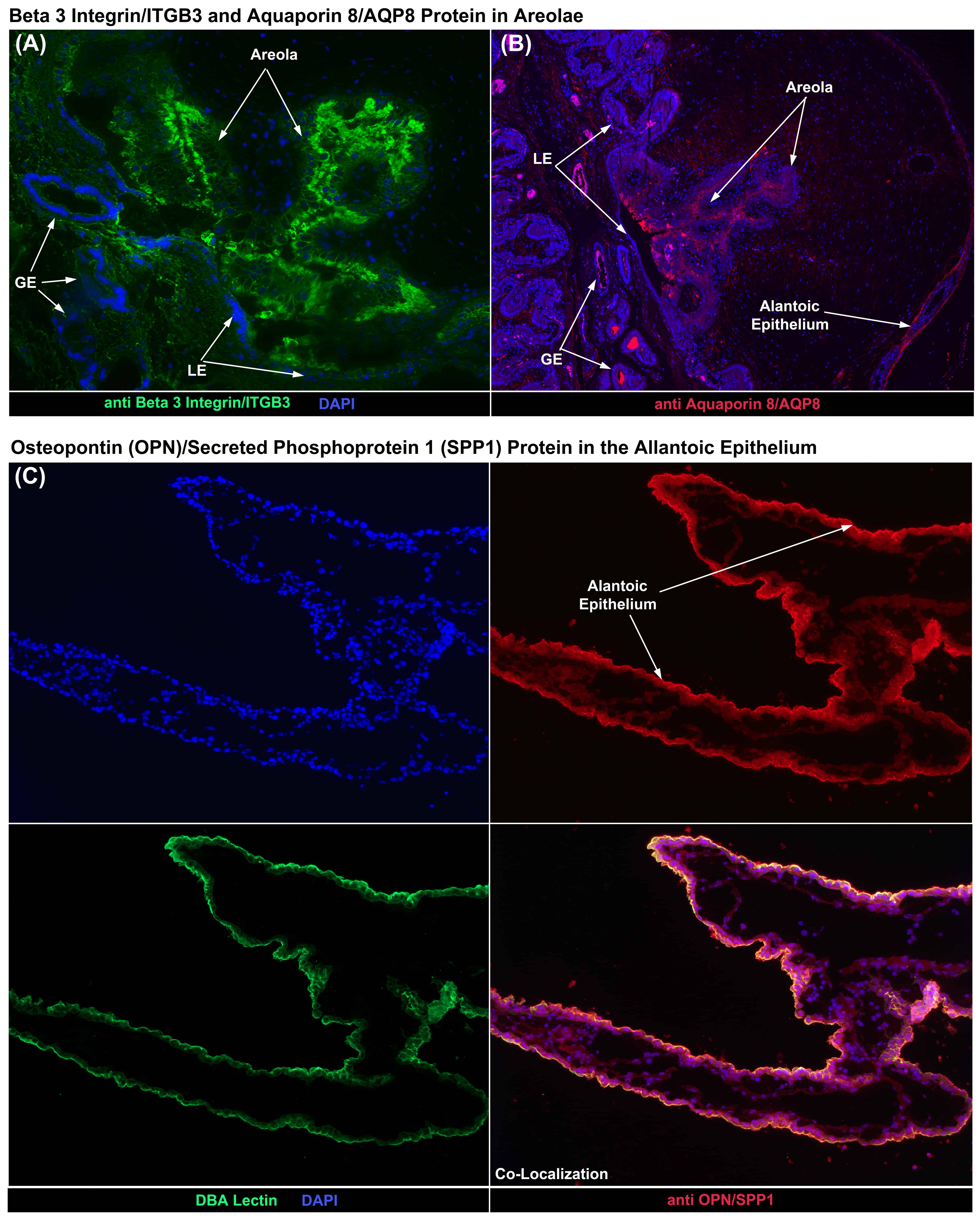 Chorionic areolae are composed of specialized tall columnar epithelial cells that are not closely apposed to the uterine luminal epithelium (LE), and form a pouch at the openings of the mouths of uterine glands to receive the secretions of uterine glandular epithelium (GE). Areolae transport glandular secretions across the placenta and into the fetal-placental circulation [26]. ITGB3 can noncovalently link to the alpha v integrin subunit (ITGA3) to form an integrin receptor that binds to OPN/SPP1 and has been demonstrated to engage OPN/SPP1 on porcine uterine LE and conceptus trophectoderm cells [13, 14]. Aquaporins (AQPs) are water-selective channels that function as pores for water transport through the plasma membrane [27]. Fig. 3A,B demonstrate expression of ITGB3 and AQP8 protein at the apical surface of the tall columnar cells of porcine areolae on Day 60 of gestation. In addition AQP8 is expressed at the apical surface of uterine GE and allantoic epithelial cells (Fig. 3B).