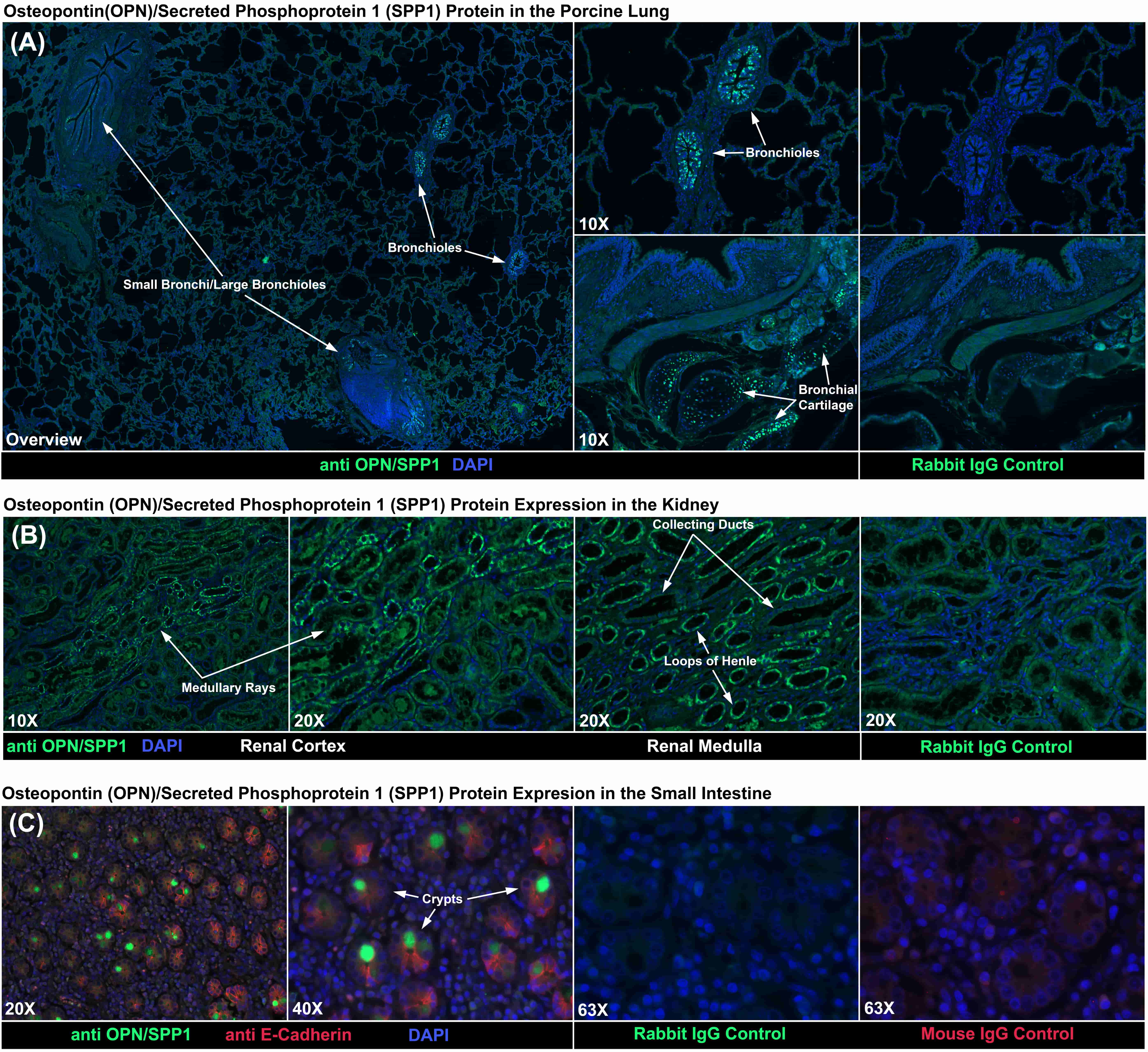 Results strongly suggest that OPN/SPP1 mediates ion transport across the porcine choriollantois. The porcine placenta, indeed all placentae, are highly adapted for transport of ions, water, nutrients, etc. across the tissue, and OPN/SPP1 is expressed by porcine uterine LE and GE [11, 12]. Therefore we examined the cell-type specific expression of OPN/SPP1 in other tissues known to be adapted for transport including the lung, kidney and small intestine. Within the lung, OPN/SPP1 protein was localized to a small subset of bronchioles with a punctate pattern of immunostaining (Fig. 4A). In addition OPN/SPP1 protein was detected in the bronchial cartilage, which is to be expected, and suggests effective immunostaining (Fig. 4A). Within the kidney, OPN/SPP1 protein was localized to the collecting ducts of both the cortical medullary rays and the renal medulla (Fig. 4B). Within the small intestine OPN/SPP1 protein was localized to a subpopulation of goblet cells (Fig. 4C).