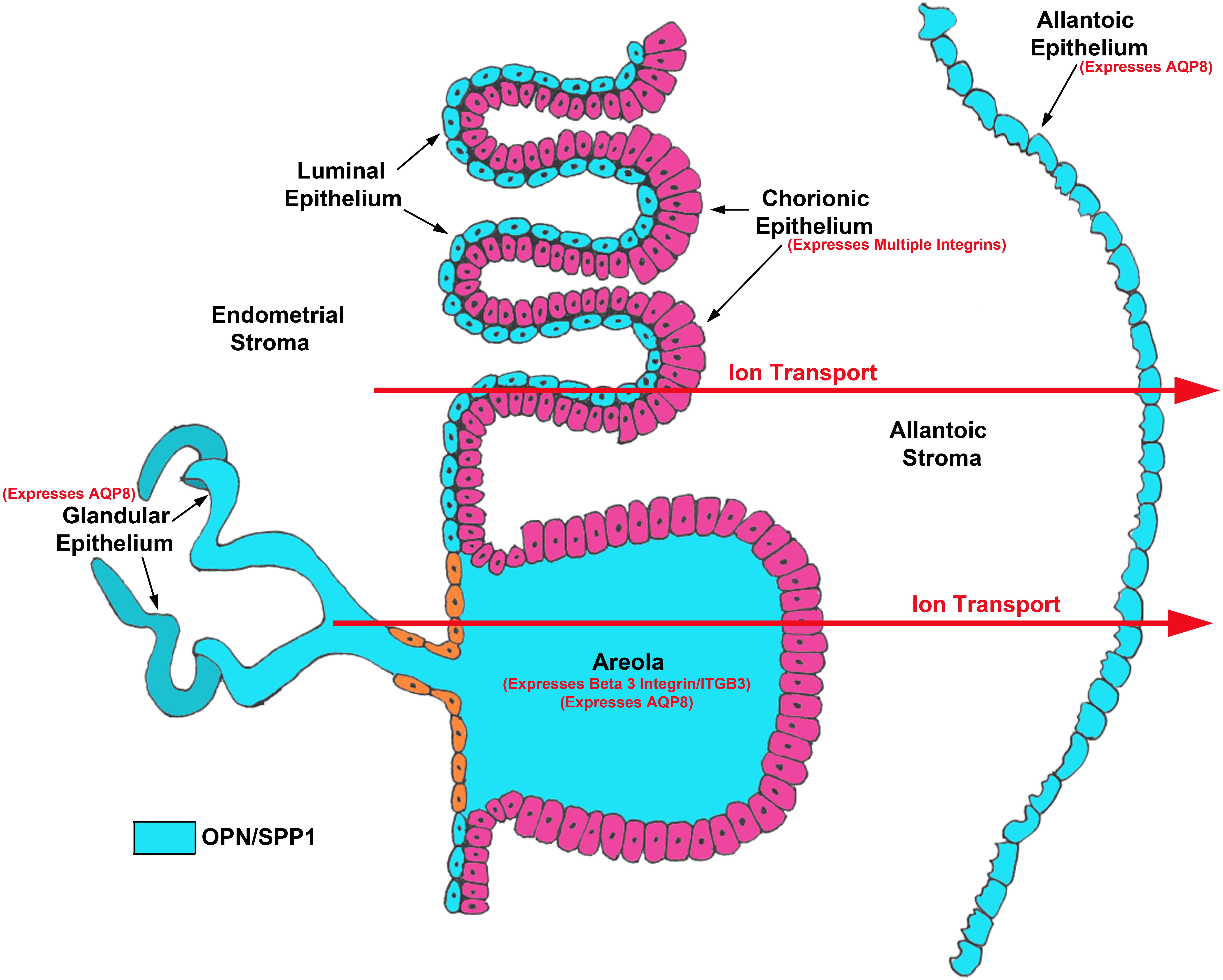 Fig. 5.Working model for OPN/SPP1 mediated ion transport across the porcine placenta. In the pig, for an ion to transport from the mucosal to the serosal side of the chorioallantois it must pass through the cytoplasm and basement membrane of the chorionic epithelial cells of the folded inter-areolar regions of placentation and areolae, across the remaining allantoic stroma, and through the basement membrane and cytoplasm of the allantoic epithelial cells [26]. OPN/SPP1 is highly expressed by both the uterine LE and GE of pigs which potentially supply secreted OPN/SPP1 protein to the to areolar and inter-areolar chorionic epithelium [11]. OPN/SPP1 has also been localized within the porcine allantoic stroma [15], and Fig. 3C demonstrates OPN/SPP1 expression in the allantoic epithelium. Multiple integrin subunits that could assemble into integrin receptors that bind OPN/SPP1 have been localized to the apical surface of inter-areolar chorionic epithelium [14], and Fig. 3A demonstrates beta 3 integrin (ITGB3) subunit expression in areolar chorionic epithelial cells. Transporters have been localized to key tissues within the chorion of pigs including SLC2A3 and SLC2A8 [24, 41], and Fig. 3B demonstrates aquaporin 8 (AQP8) expression in the uterine GE, areolar chorionic epithelium and allantoic epithelium.