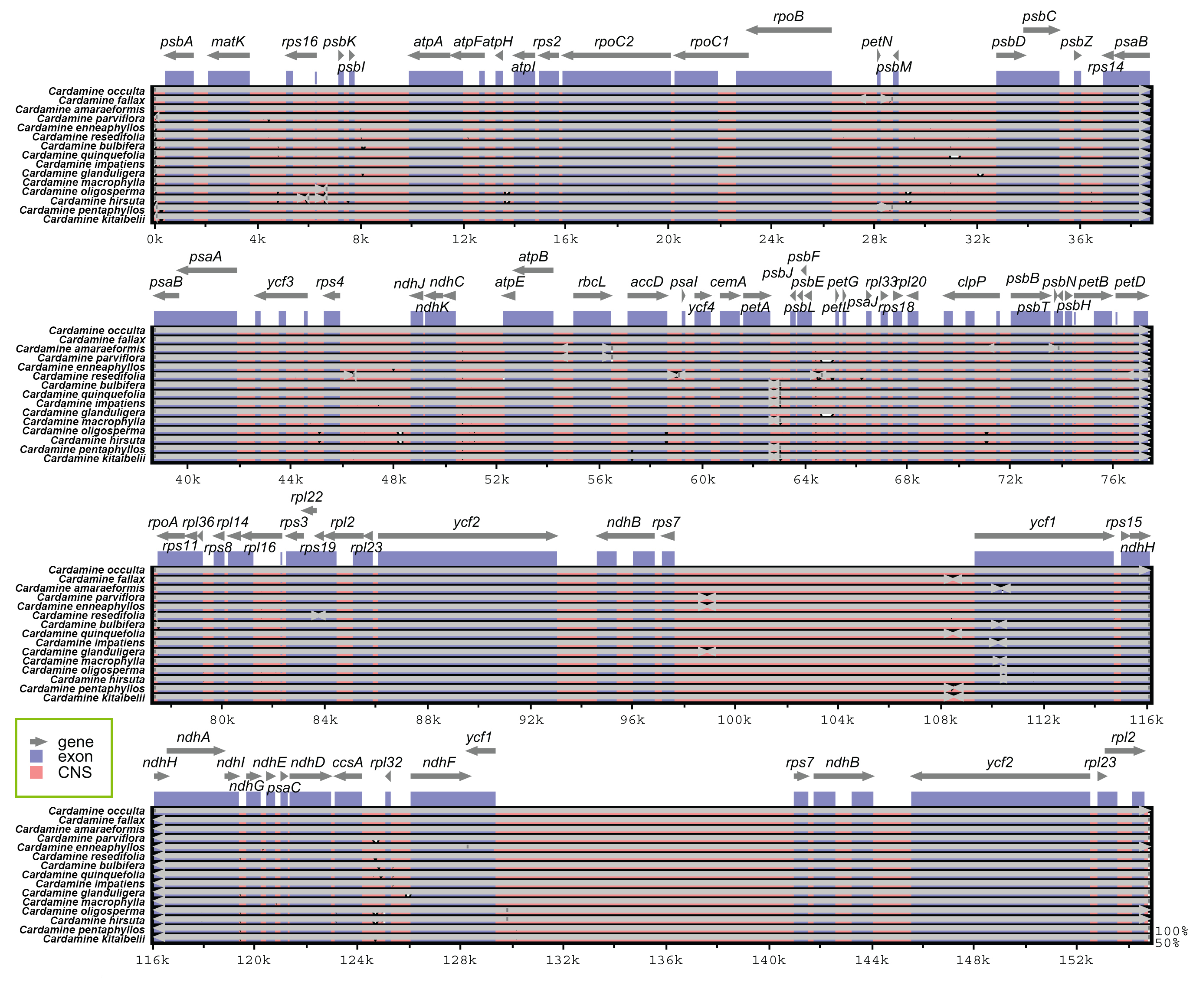 The mVISTA program in the Shuffle-LAGAN model was applied to analyze the cp genome of C. occulta with 14 other closely related cp genomes of Cardamine genus, applying C. occulta annotation as a reference [26]. The boundaries between the IR and SC regions of all the genera of Cardamine were also compared and investigated.