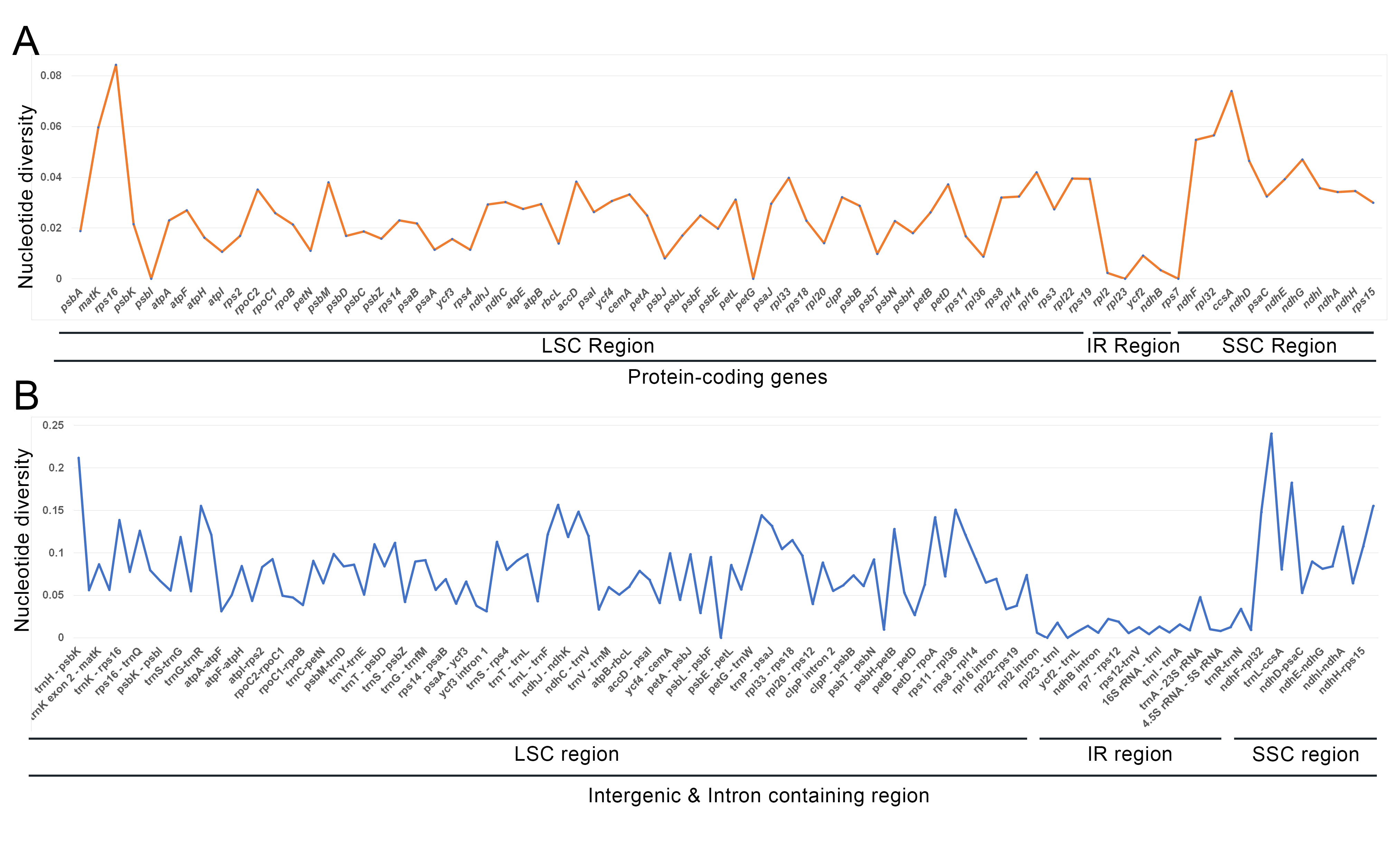 | Protein-coding regions | Nucleotide diversity (Pi) | Aligned length (bp) | No. of variable sites | IGS & Intron regions | Nucleotide diversity (Pi) | Aligned length (bp) | No. of variable sites |