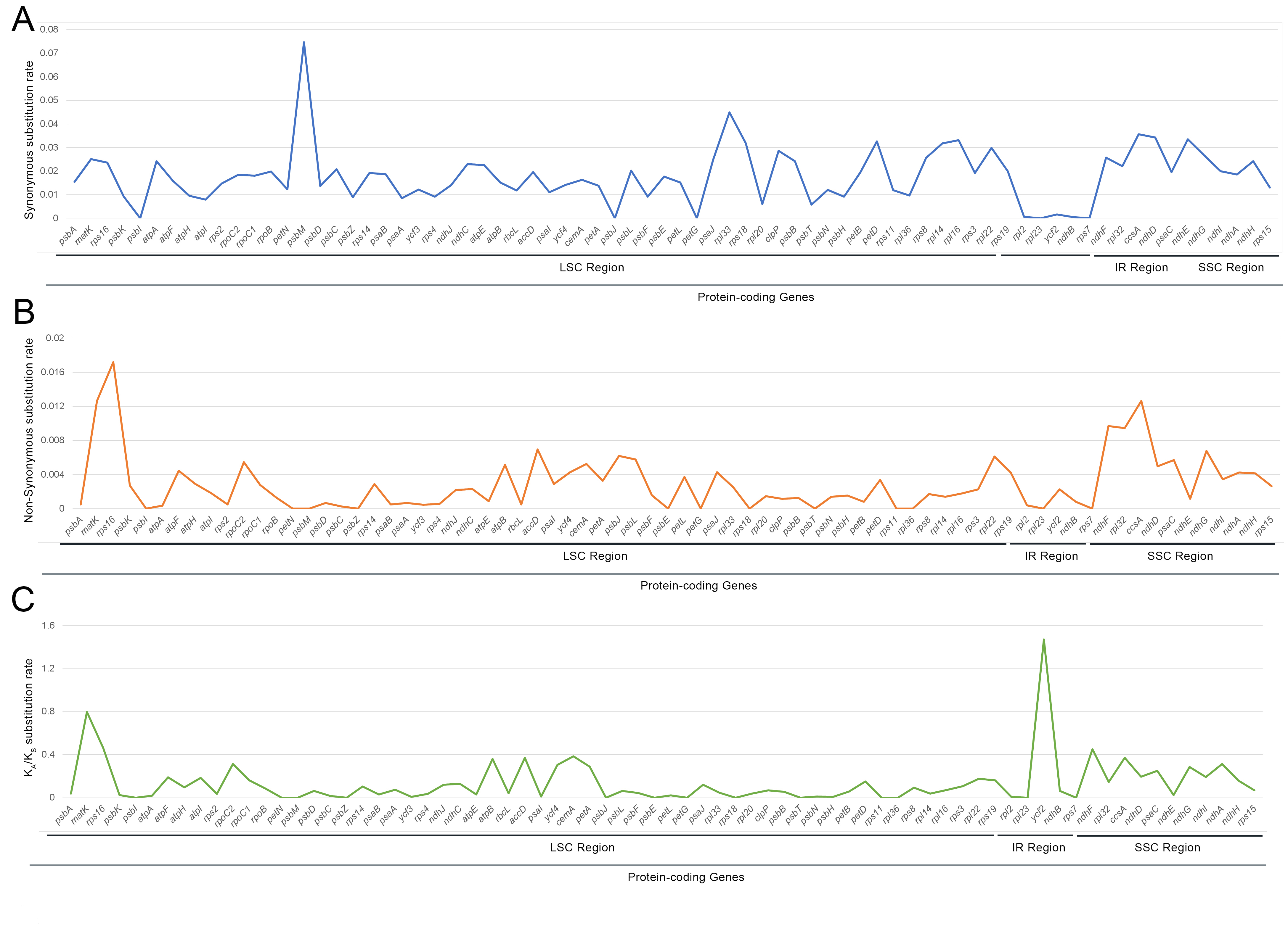 Fig. 4.Genetic diversity based on Kimura’s two-parameter model. (A) The P-distance value of protein-coding genes. (B) The P-distance value of intron and intergenic regions.