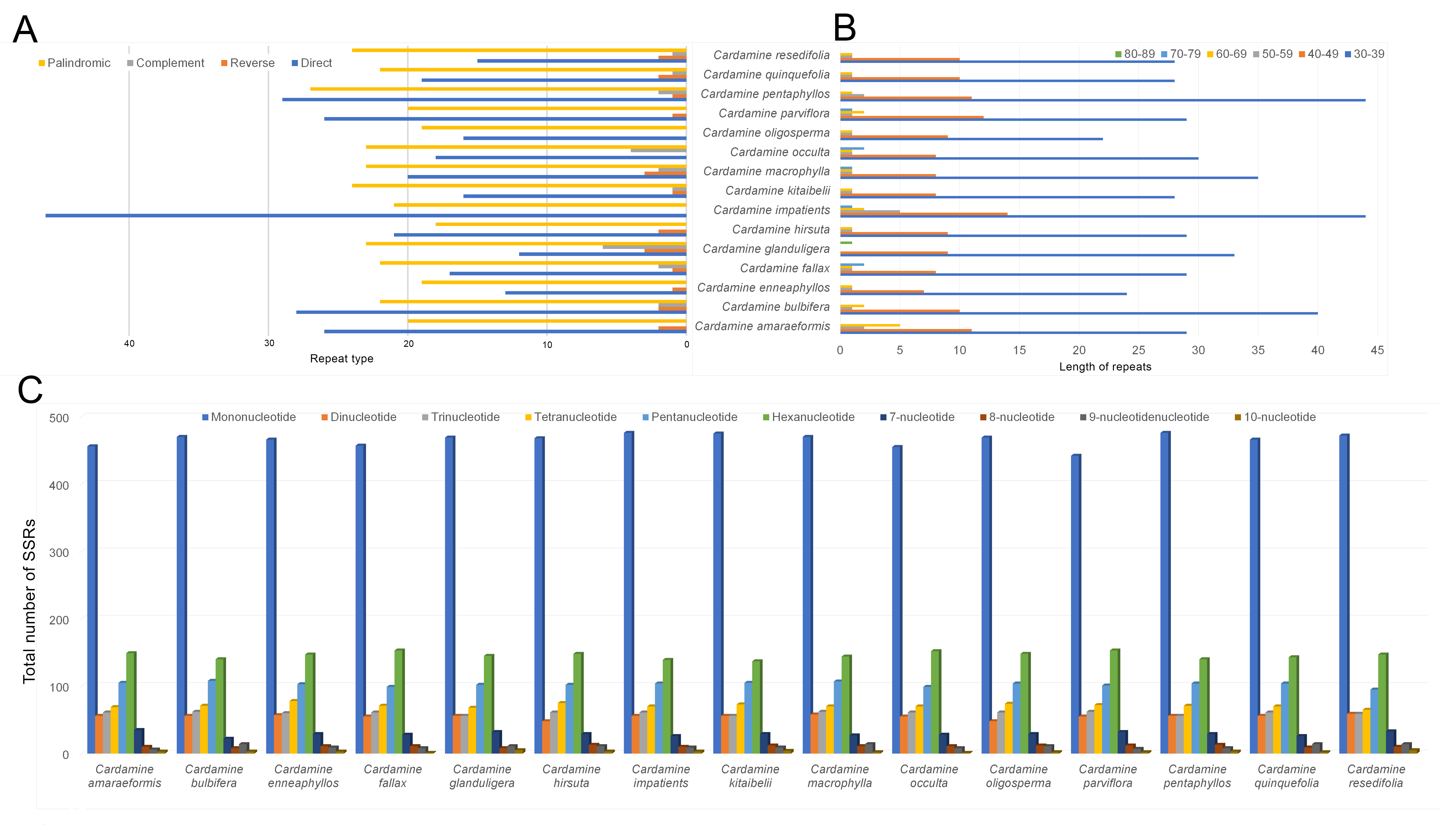 Fig. 6.Comparison of the distribution of different repeat types and SSRs in the fifteen species of Cardamine cp genomes. (A) The number of different types of repeats. F—forward repeats; R—Reverse repeats; P— palindromic repeats; C—complement repeats. (B) The length and the total number of repeat sequences present in their respective cp genomes. (C) Distribution of different types of SSRs.