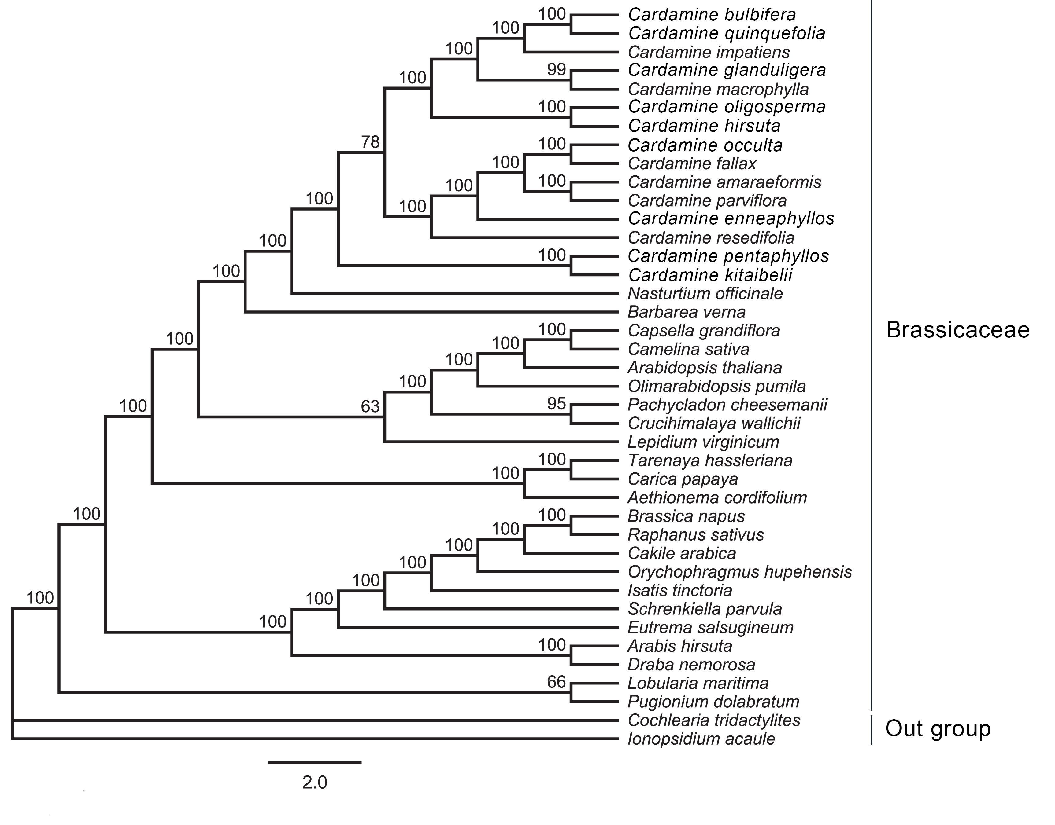 Fig. 7.Molecular phylogenetic tree based on 68 protein-coding genes of 40 Brassicales chloroplast genomes. Ionopsidium acaule and Cochlearia tridactylites were set as the outgroup. The tree was constructed by maximum likelihood analysis of the conserved regions using the RAxML program and the GTRGAMMA nucleotide model. The stability of each tree node was tested by bootstrap analysis with 1000 replicates. The bootstrap values are shown on the branches, and the branch length reflects the estimated number of substitutions per 1000 sites.