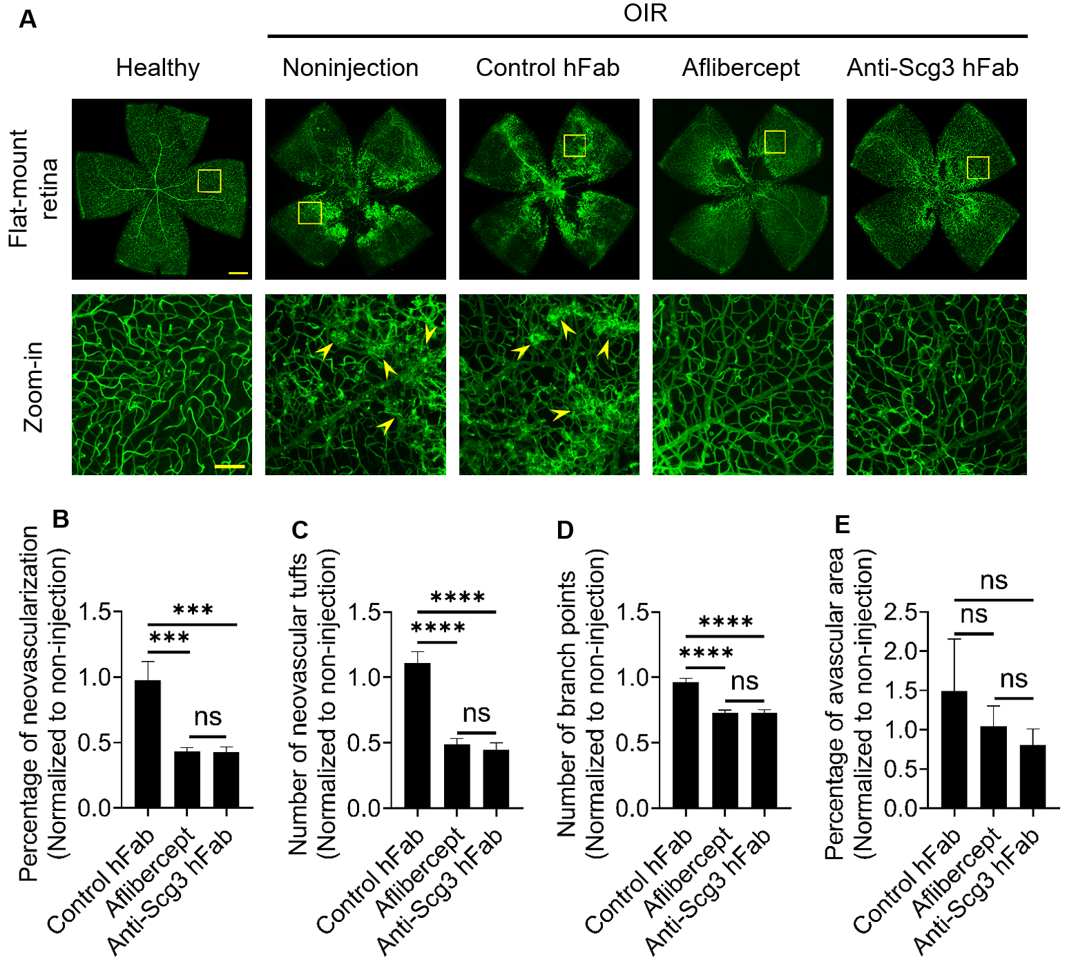 OIR mice received i.p. injection of anti-Scg3 hFab, aflibercept or control hFab