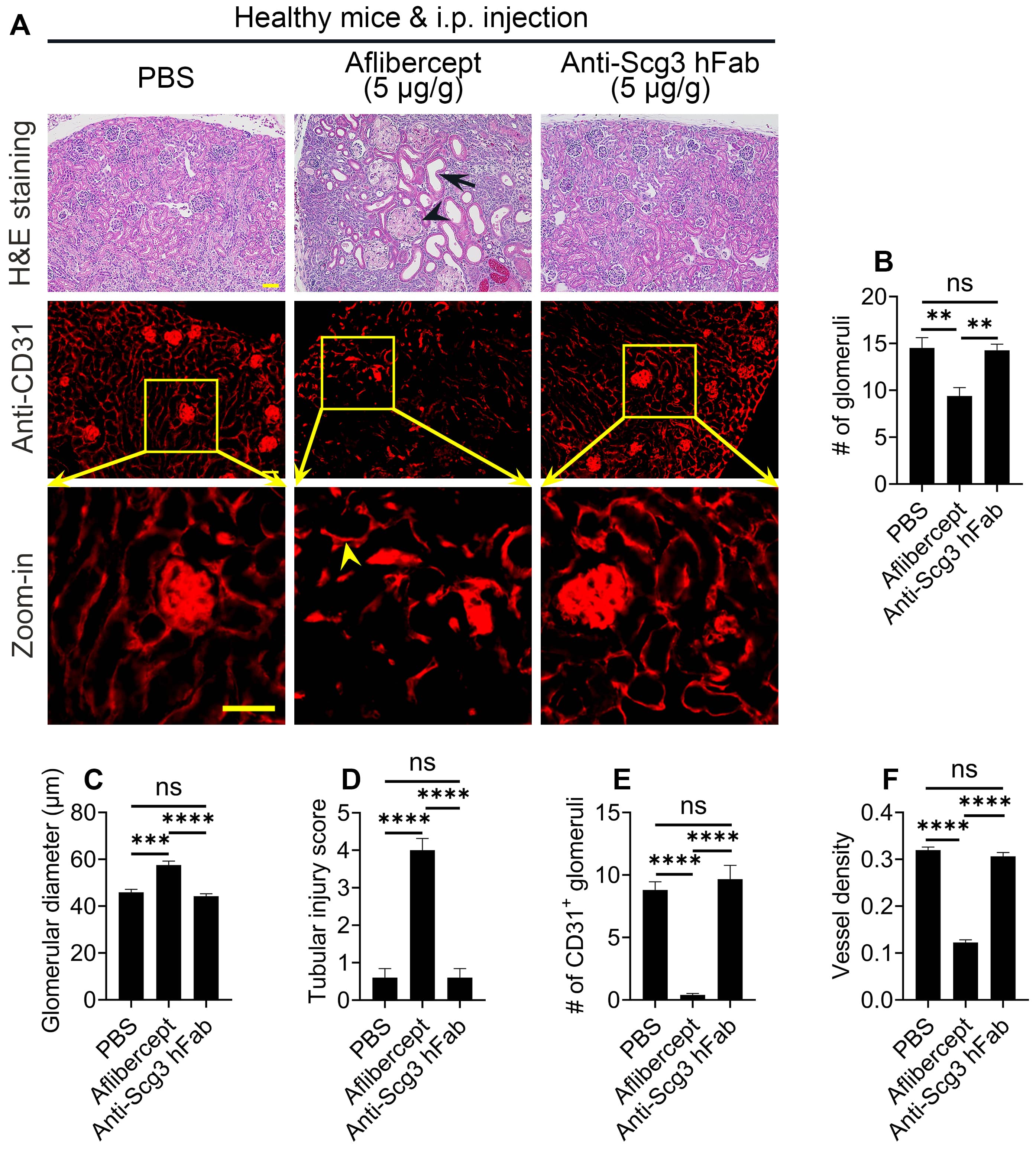 The kidney is one of the most vascularized organs, and systemic bevacizumab for cancer therapy is known to cause proteinuria [12, 23]. Here, we injected i.p. aflibercept or anti-Scg3 hFab into healthy neonatal mice and compared the effects on kidney development. Histological examination revealed that aflibercept significantly reduced the number of glomeruli and increased the glomerular size (Fig. 4A, top row; Fig. 4B,C). Additionally, H&E staining detected dilation of renal tubules in aflibercept-treated mice (Fig. 4A, top panel), and quantification revealed significantly increased tubular injury score in the aflibercept group (Fig. 4D).