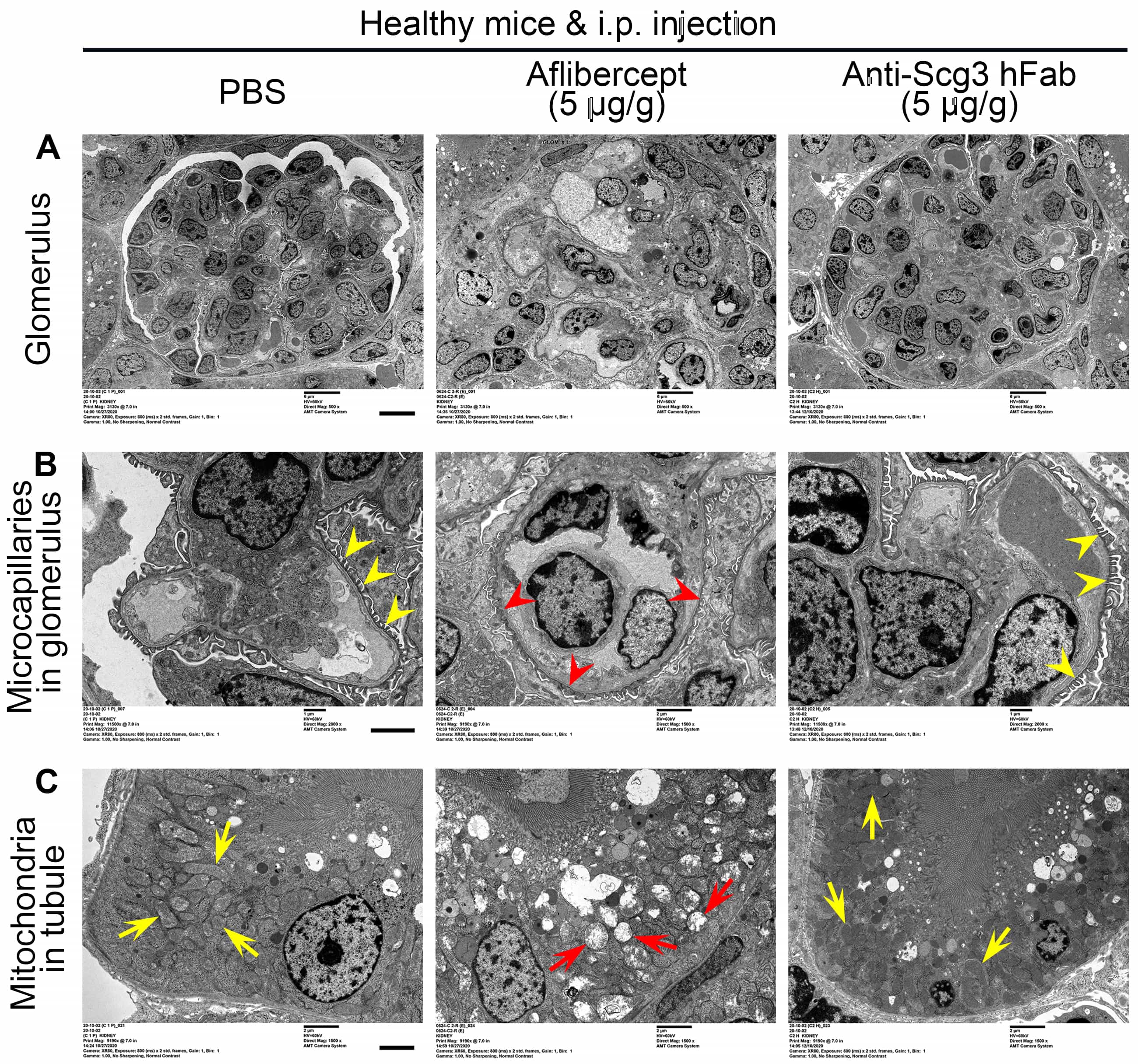 Electron microscopy revealed changes in kidney ultrastructure (Fig. 5). Systemic aflibercept disrupted the glomerular ultrastructure with abnormal cells (Fig. 5, top row), reduced the foot processes of podocytes (Fig. 5, middle row), and induced mitochondrial swelling (bottom row). In contrast, systemic anti-Scg3 hFab did not adversely impact the normal renal ultrastructure, compared with PBS.