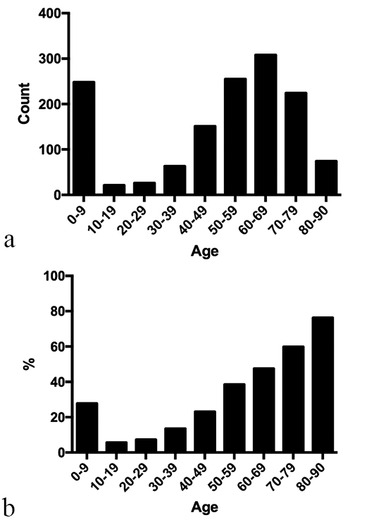 Fig. 2.The counting numbers and percentage of malignant eye tumors in different age groups. (a) Counting numbers of malignant eye tumors in different age groups. Age 0–9 years and 60–69 years were the two peaks of the incidence of malignant eye tumors. (b) The percentage of malignant eye tumors in different age groups. Age 0–9 years was the first peak of the incidence of malignant eye tumors, the lowest incidence was shown in age 10–19 years and then gradually increases and reaches its second peak by age 80–90 years.