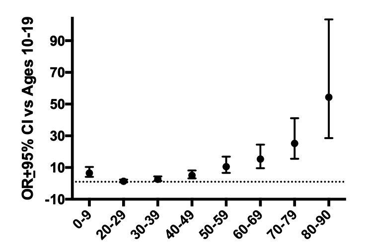 In general, the percentage of eye tumors was the highest at age 0–9 years (19.7%), and decreased to 8.31% at age 10–19 years, 7.9% at age 20–29 years, increased to 10.3% at age 30–39 years, peaked at age 50–59 years (14.7%), remained high at age 60–69 years (14.3%), decreased at age 70–79 years (8.3%), and reached the lowest at age 80–90 years (2.1%) (Supplementary Table 1). There were two peaks for the incidence of malignant eye tumors, one occurring at age 0–9 and the other at 60–69 years, based on the number of patients with a tumor, and one occurring at age 0–9 years and the other at 80–90 years, based on the percentage of patients with a tumor (Fig. 2a and Fig. 2b). With the age group 10–19 years as the reference group, children 0–9 years of age were 6.5 times as likely to have a malignant eye tumor (95% confidence interval (CI) 4.1–10.4). After age of 10 years, the odds of having a malignant eye tumor increased with age (Fig. 3).