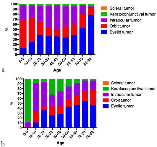 All stained tissue sections were reviewed by two ocular pathologists (ophthalmologists with a specialization in ocular pathology). The tumors were classified as either benign or malignant. The primary diagnosis of eye tumor was further categorized based on anatomic locations into: eyelid, keratoconjunctival, orbit, intraocular, and scleral tumors. To assess the age distribution of various eye tumors, age was grouped into 10-year intervals following our previous publication [7].