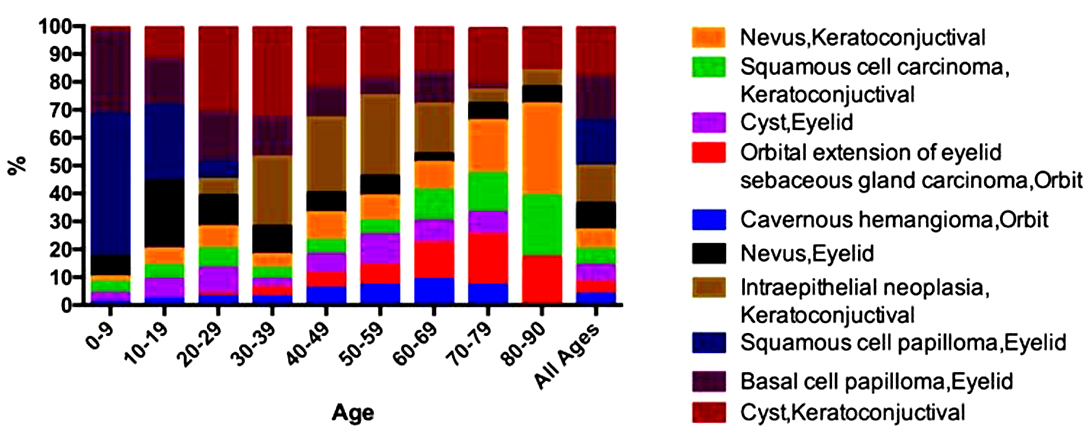 Fig. 5.The incidence of top 10 benign eye tumors in different age groups. Of benign tumors, 67% (N = 2104) were included in the top 10, while 48.7% (N = 1537) were included in the top 5. Squamous cell papilloma is the dominated benign tumor in early life from age 0–19; most of kertoconjuctival cyst is seen in young adult; the highest prevalence of kertoconjuctival nevus can be found in the age 80–90 years; over all the top 3 benign ocular are basal cell papilloma, kertoconjuctival cyst and squamous cell papilloma.