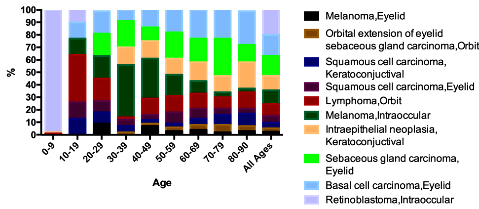 Fig. 4.The age distribution of eye tumors. (a) The age distribution of benign eye tumors. Orbit tumors have a much higher incidence in younger ages from 0–9 to 10–29 years, while eyelid tumors incidence increases with age and over age 80 year it accounts for 78%. Intraocular tumors are most common eye tumor between the ages of 30 and 70, representing an incidence between 40%–47% in those age groups. There is no much variability of the incidence of keratoconjunctival benign tumor cross age. (b) The age distribution of malignant eye tumors. In children less than 10 years of age, the most prevalent malignant tumor is keratoconjunctival tumor (89%). This type of tumor represents about one-third of the tumors in age 30–49 years. The incidence of malignant eyelid tumors, which were very rare under the age of 20 increases across adulthood. The prevalence of intraocular tumors is highest in teenagers and young adults (age 10–29 years). The peak incidence of orbit tumors is seen in age 80–90 years.