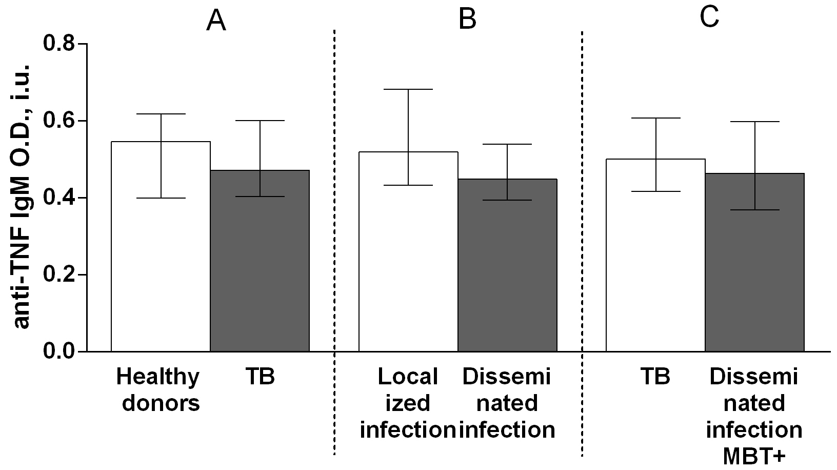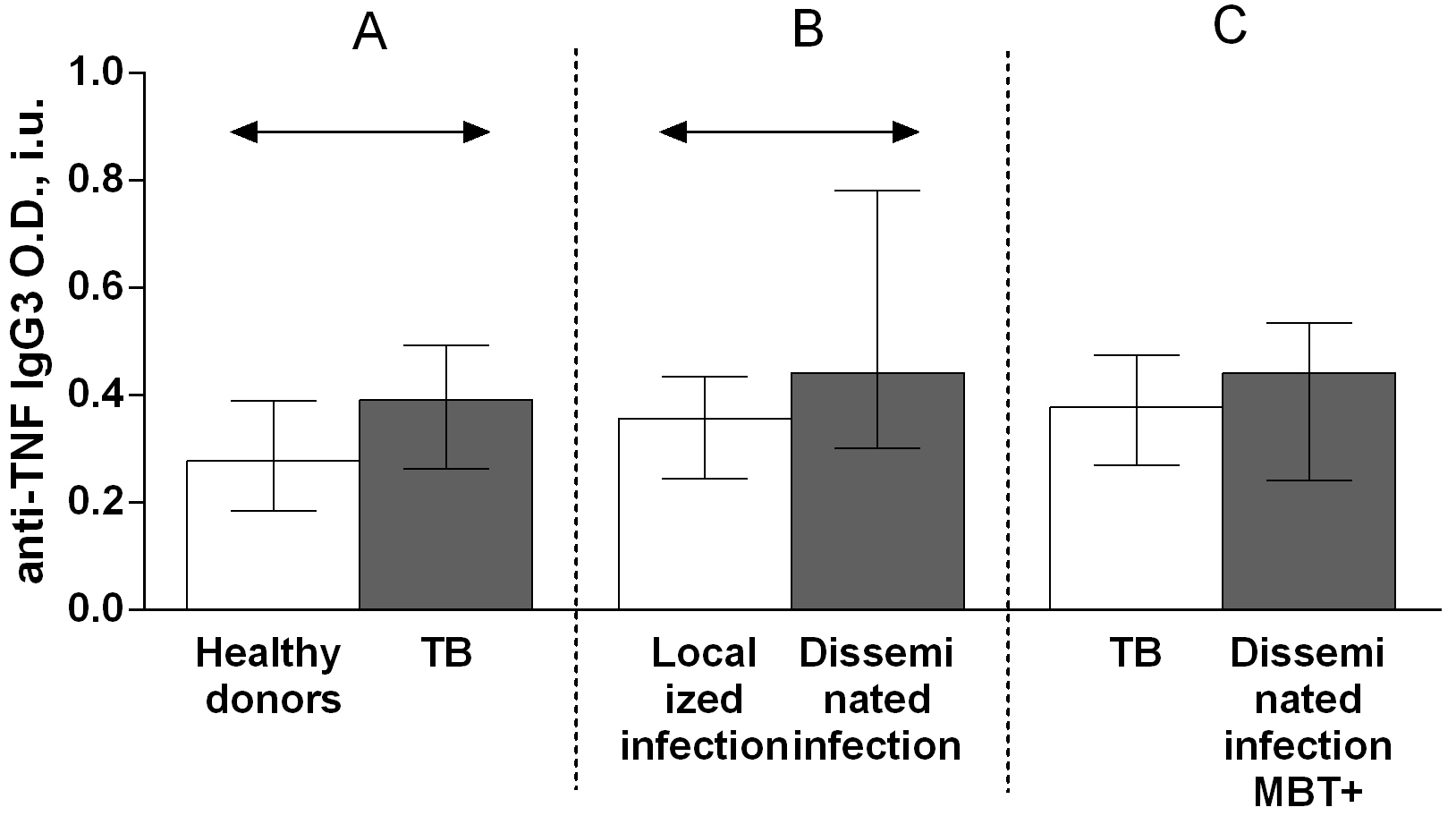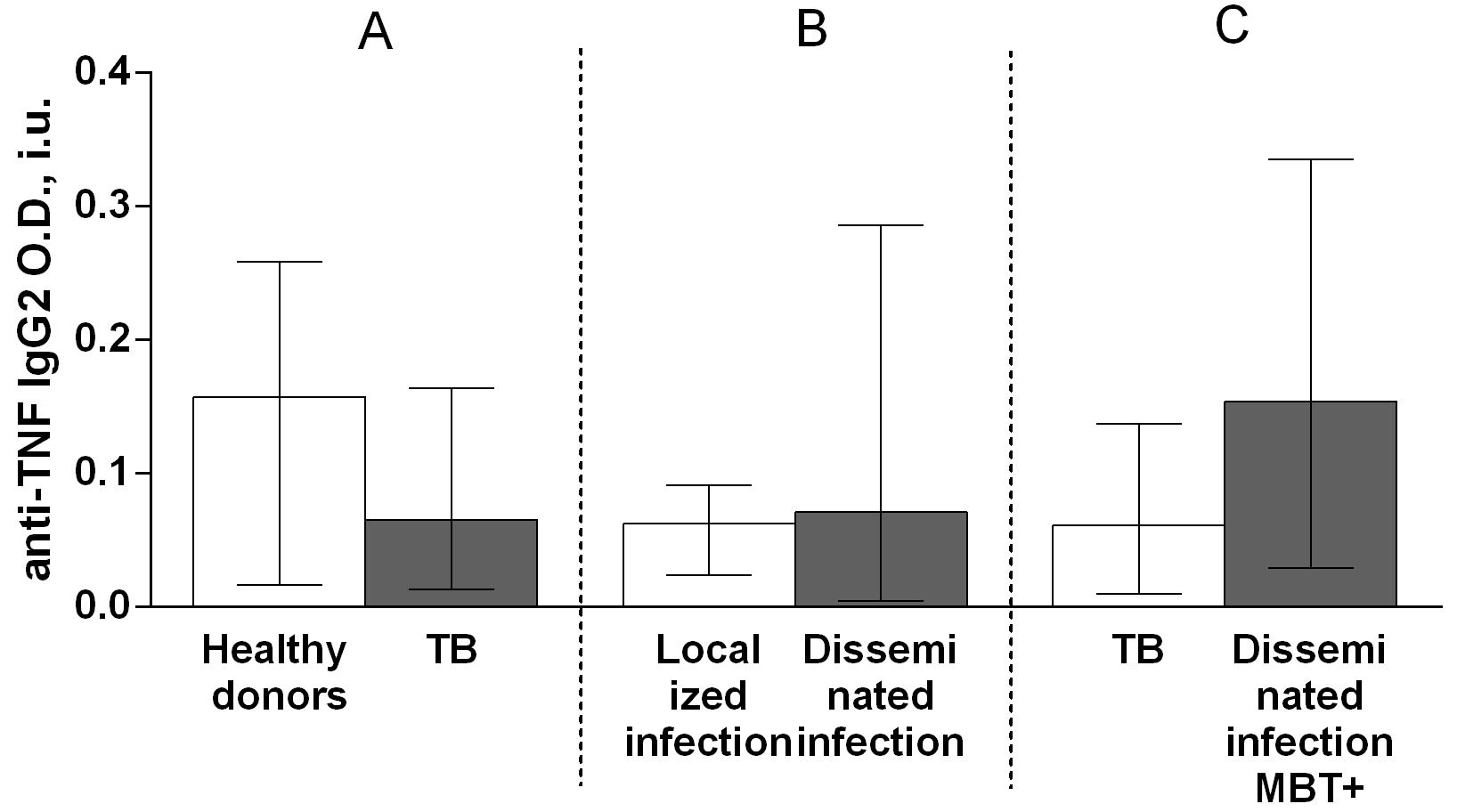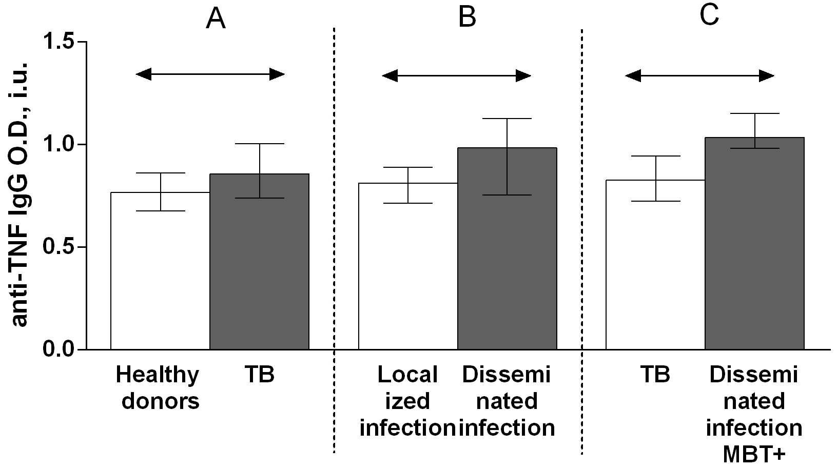 Background: Tumor necrosis factor (TNF) plays an important role in immune responses to the causative agent of tuberculosis, Mycobacterium tuberculosis. Additionally, TNF can also mediate many negative disease manifestations. The aim of this study was to assess the contribution of anti-TNF autoantibodies to the pathogenesis of active pulmonary tuberculosis (TB). Methods: The levels of anti-TNF autoantibody classes and subclasses were determined by applying enzyme-linked immunosorbent assays (ELISAs). The levels of TNF and of its soluble receptors were also evaluated using commercial ELISA kits. Results: The levels of both types of soluble TNF receptors were lower patients with TB than in healthy donors. Patients with TB had higher titers of immunoglobulin (Ig)G class and IgG3 subclass anti-TNF autoantibodies in comparison with healthy donors. Patients who had a disseminated TB infection had higher TNF level and IgG, IgG1 and IgG3 autoantibody titers compared with patients who had a localized TB infection. Conclusions: Changes in the titers of anti-TNF autoantibody classes and subclasses were noted in patients with TB, suggesting their possible contribution to the disease pathogenesis of TB.
