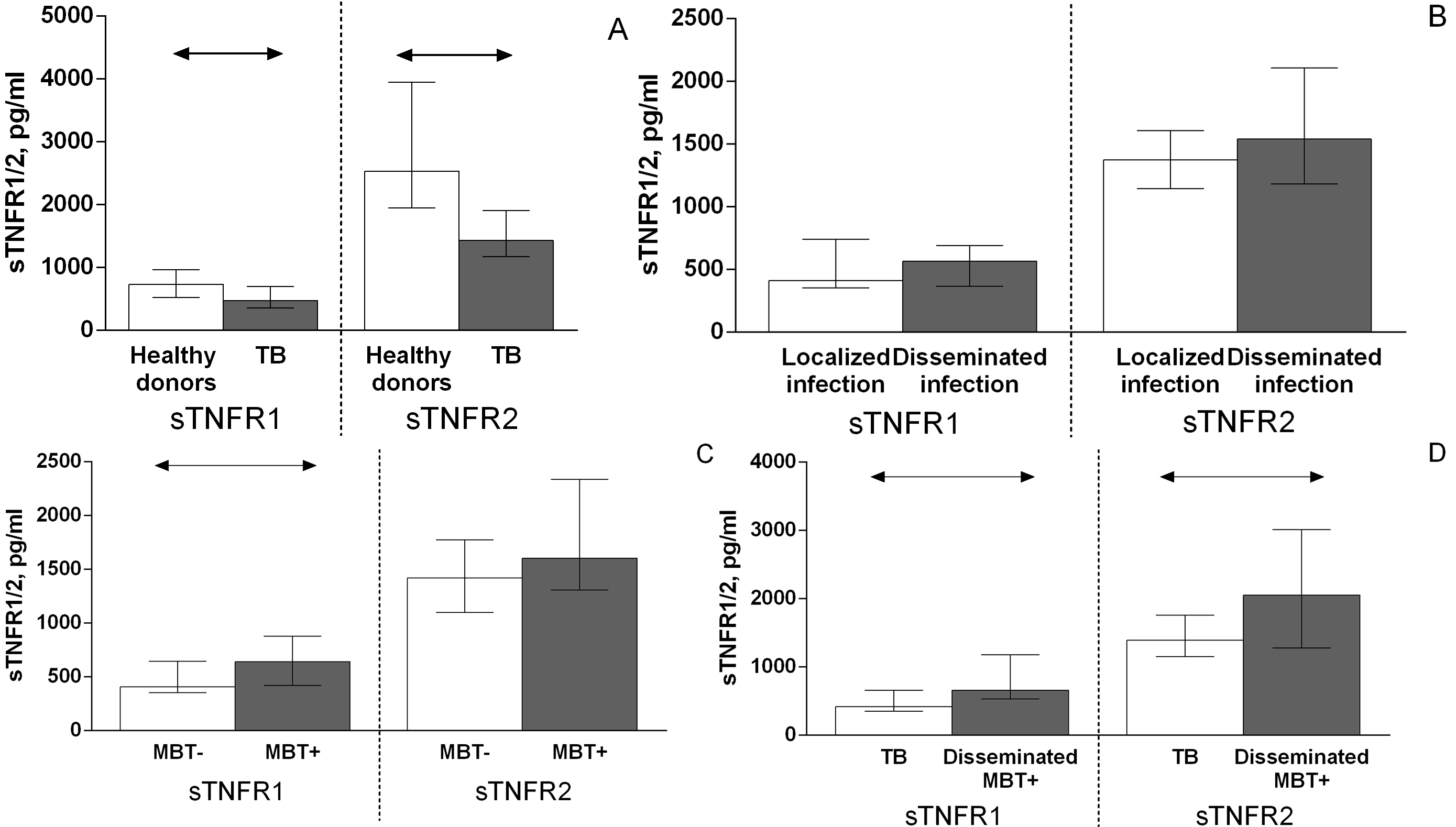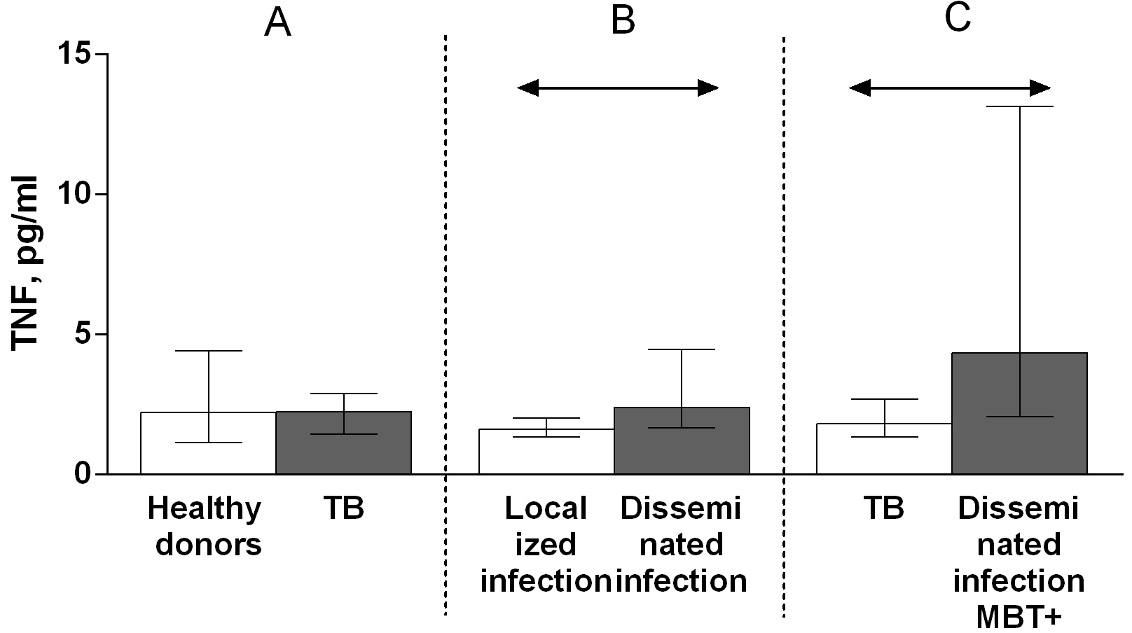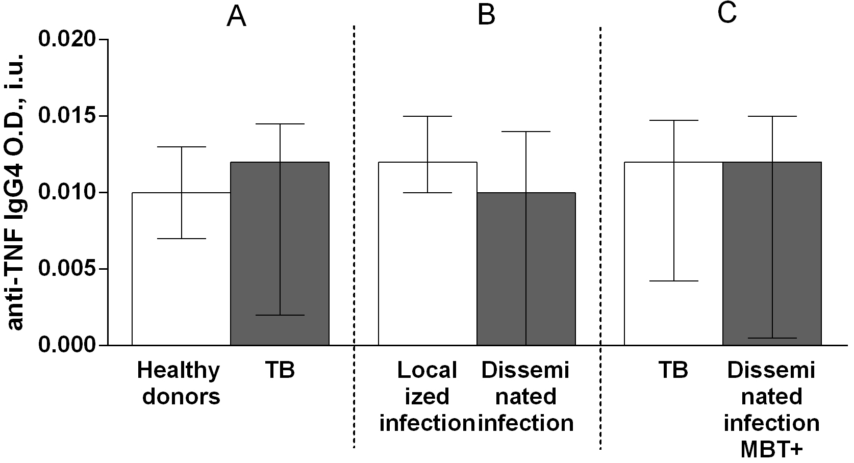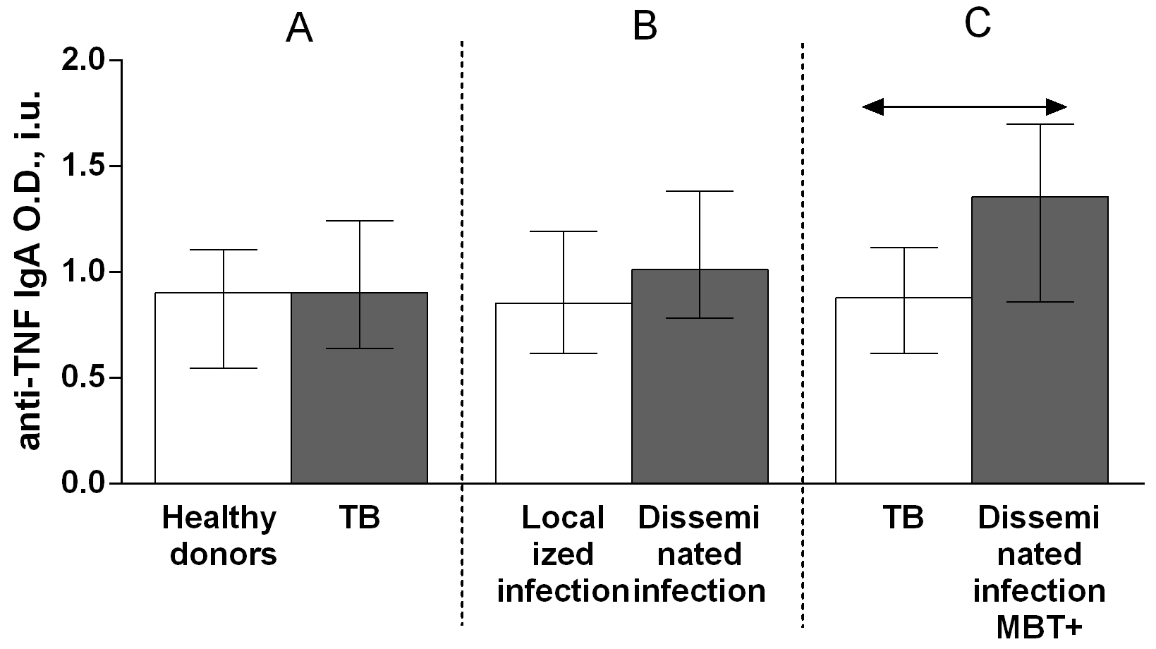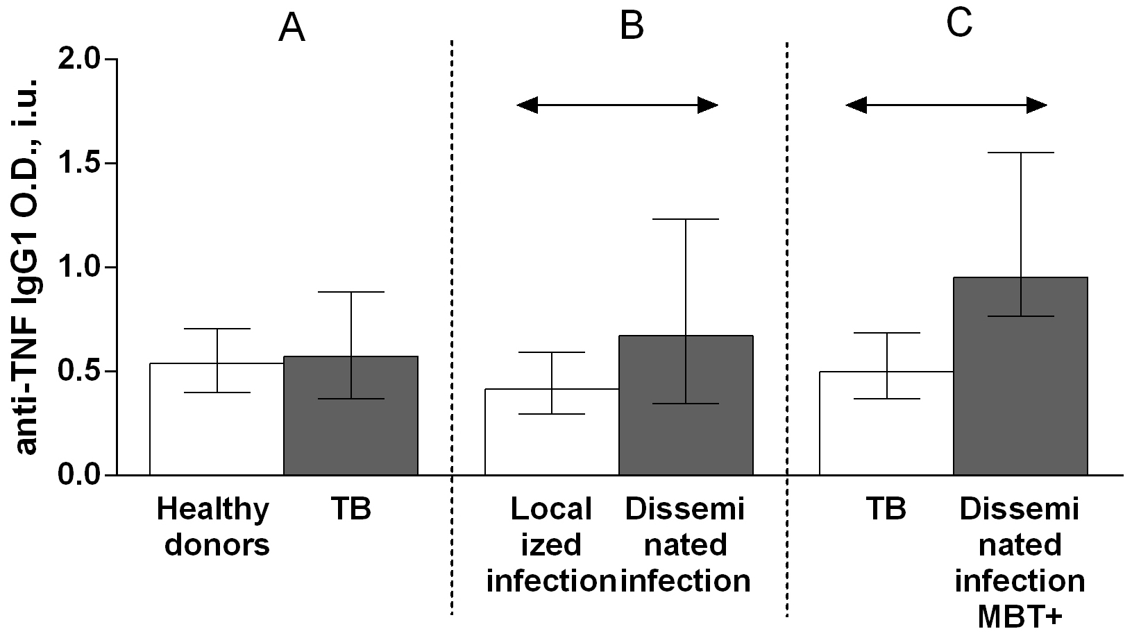 Background: Tumor necrosis factor (TNF) plays an important role in immune responses to the causative agent of tuberculosis, Mycobacterium tuberculosis. Additionally, TNF can also mediate many negative disease manifestations. The aim of this study was to assess the contribution of anti-TNF autoantibodies to the pathogenesis of active pulmonary tuberculosis (TB). Methods: The levels of anti-TNF autoantibody classes and subclasses were determined by applying enzyme-linked immunosorbent assays (ELISAs). The levels of TNF and of its soluble receptors were also evaluated using commercial ELISA kits. Results: The levels of both types of soluble TNF receptors were lower patients with TB than in healthy donors. Patients with TB had higher titers of immunoglobulin (Ig)G class and IgG3 subclass anti-TNF autoantibodies in comparison with healthy donors. Patients who had a disseminated TB infection had higher TNF level and IgG, IgG1 and IgG3 autoantibody titers compared with patients who had a localized TB infection. Conclusions: Changes in the titers of anti-TNF autoantibody classes and subclasses were noted in patients with TB, suggesting their possible contribution to the disease pathogenesis of TB.