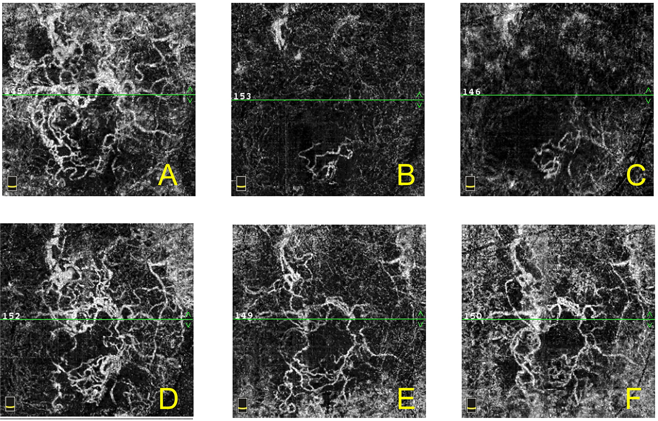 Fig. 1.OCTA en face images of a 69-year-old female patient with NVAMD in right eye showing an incomplete response to anti-VEGF treatment during 12-month follow-up (A–F). The area of the macular CNV lesion decreased in size after three consecutive monthly anti-VEGF injections (A–C). Images taken at baseline (A), one week after the 1st anti-VEGF injection (B), and one week after the 3rd anti-VEGF injection (C) are shown. The size of the macular CNV lesion increased again at six months during the follow-up period (D), one week after the 4th anti-VEGF injection (E), and 12 months at final visit (F). The thin green line at the center of each en face OCTA frame indicates the location in cross-sectional OCTA.