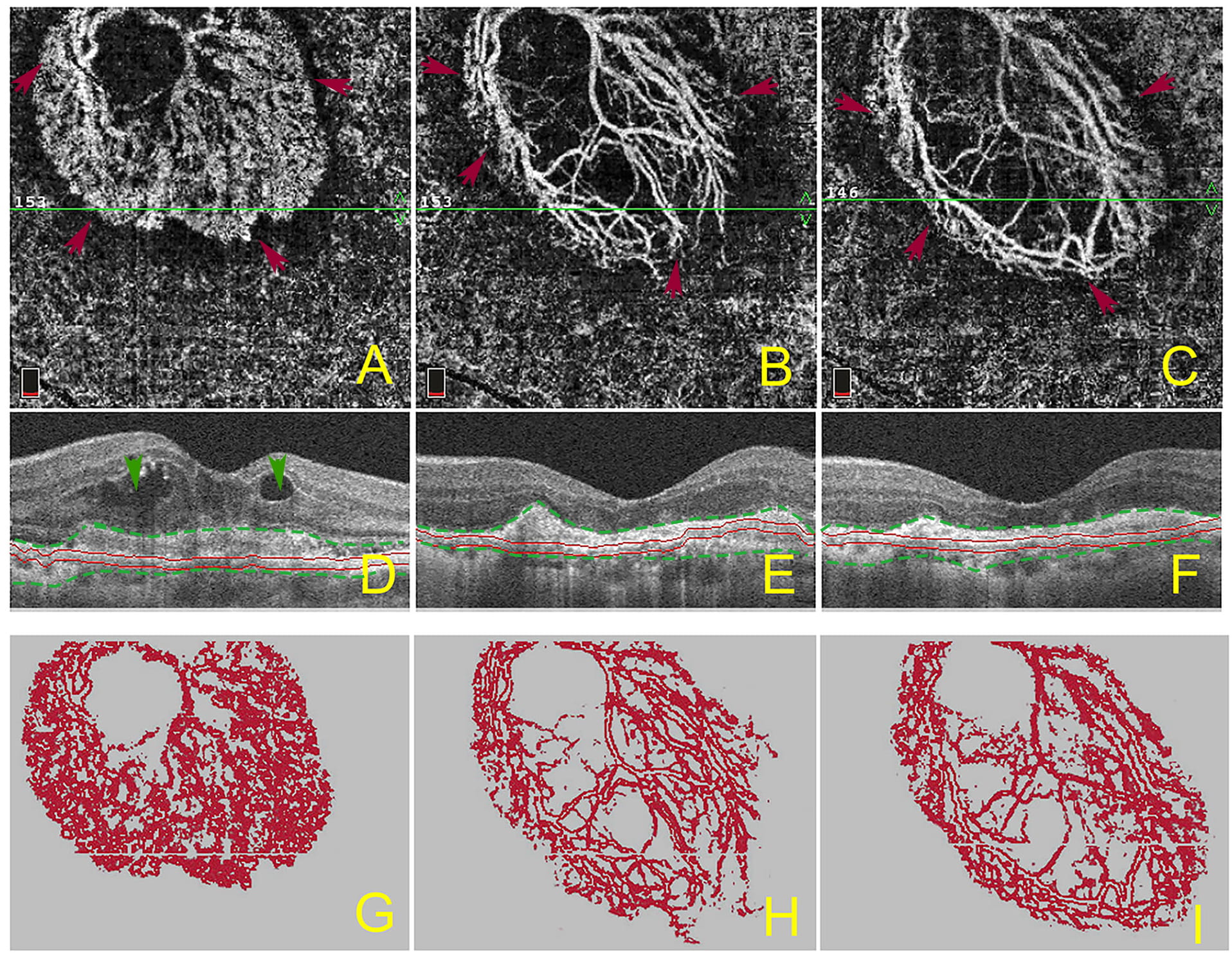 Fig. 2.Morphologic changes of macular CNV and progression of subretinal fibrosis before and after anti-VEGF treatment. The OCTA en face image (A–C) and corresponding B-scan (D–F) show the morphological changes of macular CNV lesions and progression of subretinal hyperreflective materials before, and after, anti-VEGF treatment. The OCTA en face image (A) and B-scan (D) show the macular CNV lesion and subretinal fibrosis at baseline. The OCTA en face image (B) and B-scan (E) show the macular CNV lesion and subretinal hyperreflective materials after 3 consecutive anti-VEGF injections. The OCTA en face image (C) and B-scan (F) show the macular CNV lesion and subretinal hyperreflective materials at the final 12-month follow-up timepoint. The images of G–I present the subtracted, colorized neovascular network, as perceived in the segmentation corresponding to the fibrotic lesion. Red arrows depict the boundaries of macular CNV (A–C), green arrows show the intraretinal fluids (D), green lines show the boundaries of subretinal hyperreflective materials mainly containing fibrosis and exudations (D–F).