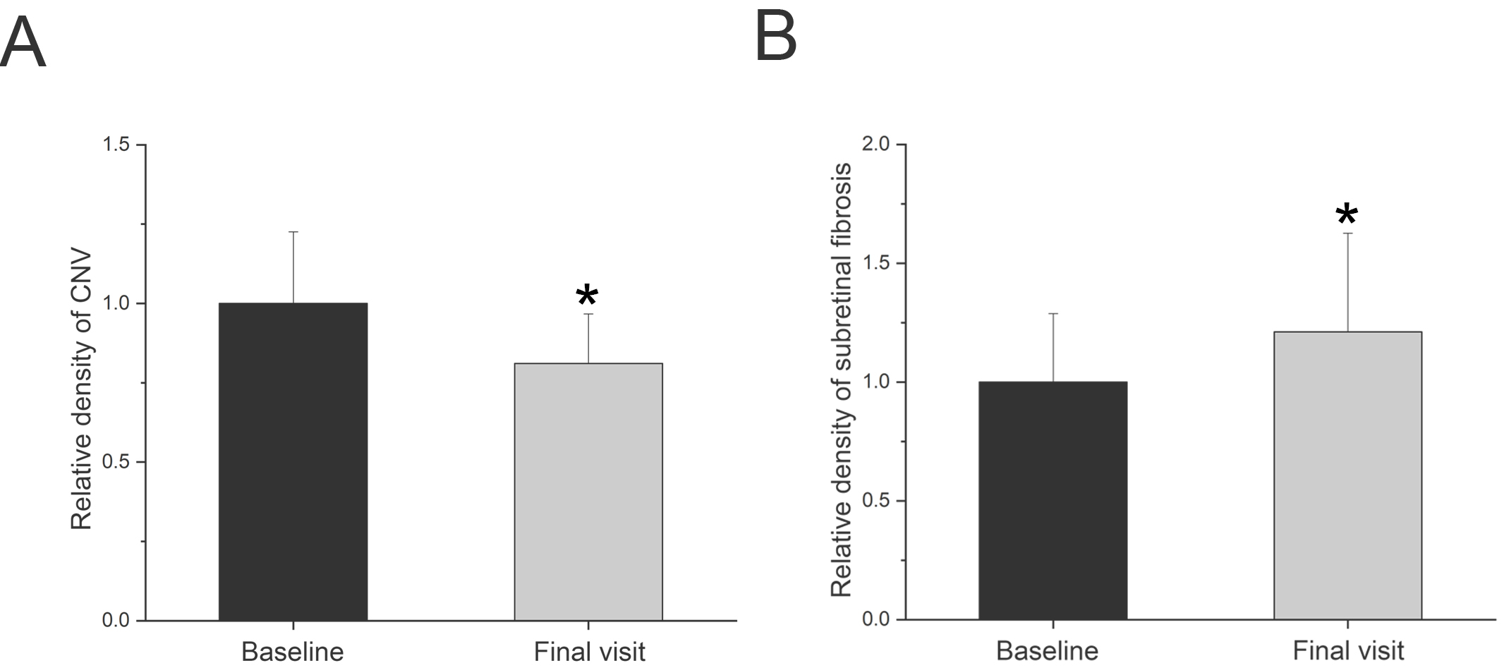 subretinal fibrosis (B) between the baseline and final follow-up visit. The data