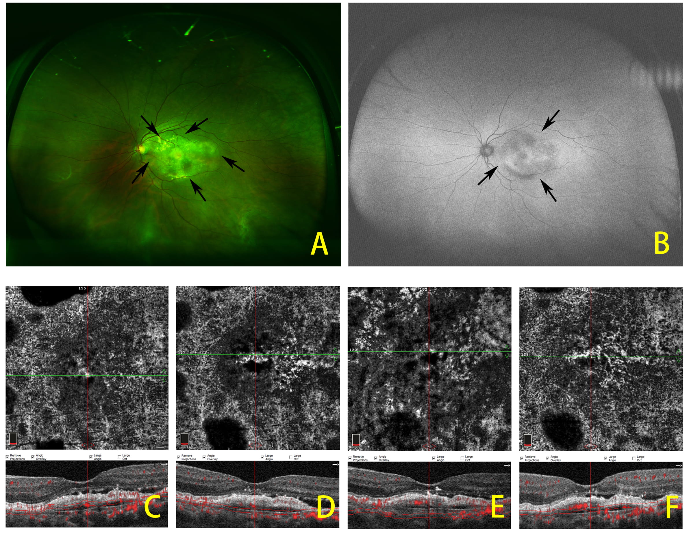Fig. 4.Representative widefield fundus images of neovascular age-related macular degeneration with subretinal fibrosis and the progression of subretinal fibrosis after anti-VEGF treatment. (A) Fundus color images of subretinal fibrosis showing elevated mound of whitish or yellowish subretinal deposition of aberrant connective tissue at, or near, the fovea. (B) Fundus autofluorescence of the same patient with subretinal fibrosis. OCTA images showing subretinal fibrosis at baseline and after 3 consecutive anti-VEGF injections are given (C–F). Arrows indicate the edge of lesion.