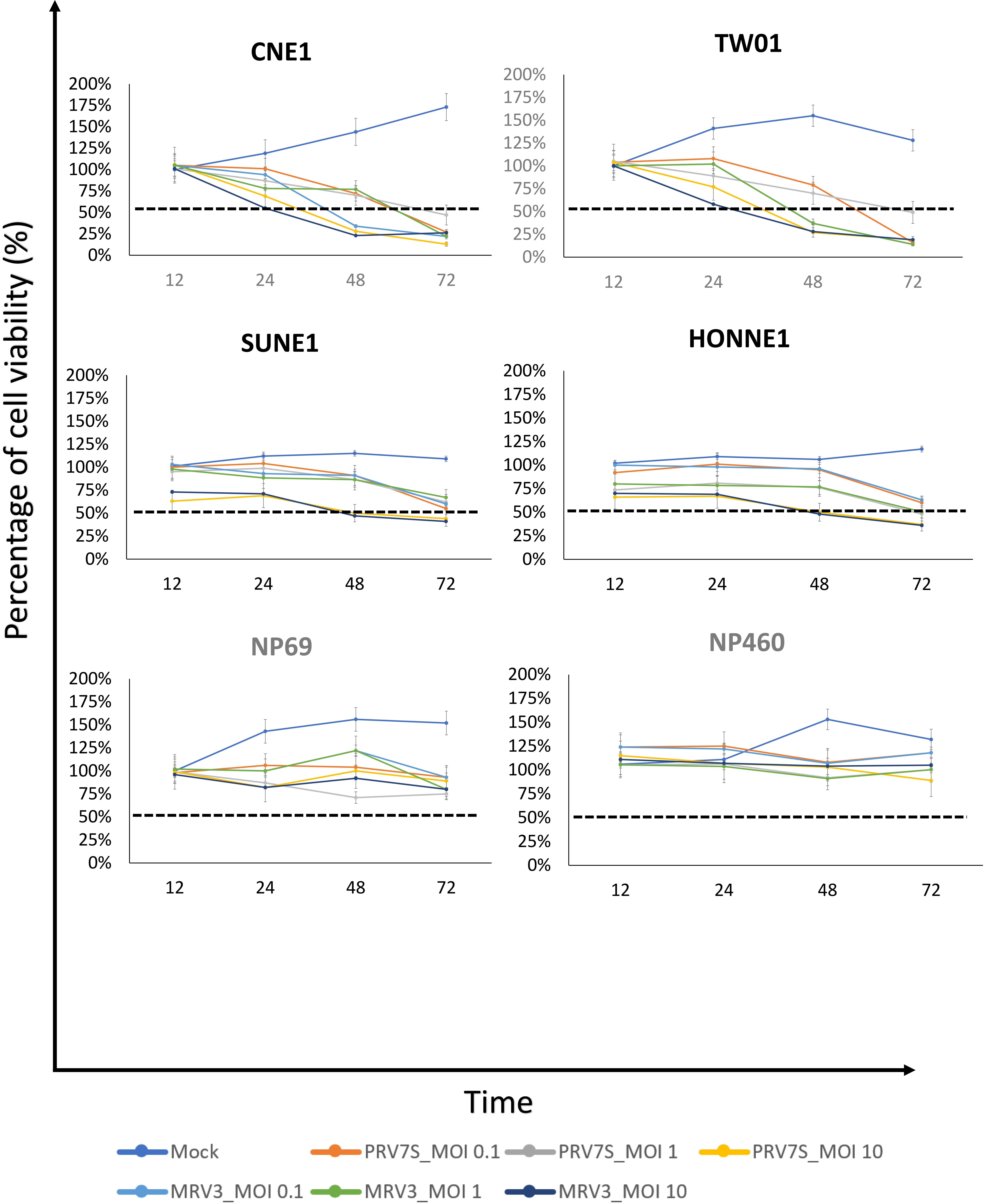 Fig. 1.Cell viability of nasopharyngeal carcinoma (NPC) cells, TW01, CNE1, SUNE1 and HONNE1 and non-carcinoma nasopharyngeal (NCNP) cells, NP69 and NP460 infected with PRV7S (Sikamat virus). MTT assay was performed at different MOI (10, 1 and 0.1) for 12, 24, 48 and 72 hrs. Black dotted line as 50% cell viability indication and different line colors represent PRV7S (Sikamat virus), MRV3 (Mammalian Orthoreovirus Type 3), and mock infection at respective MOIs.