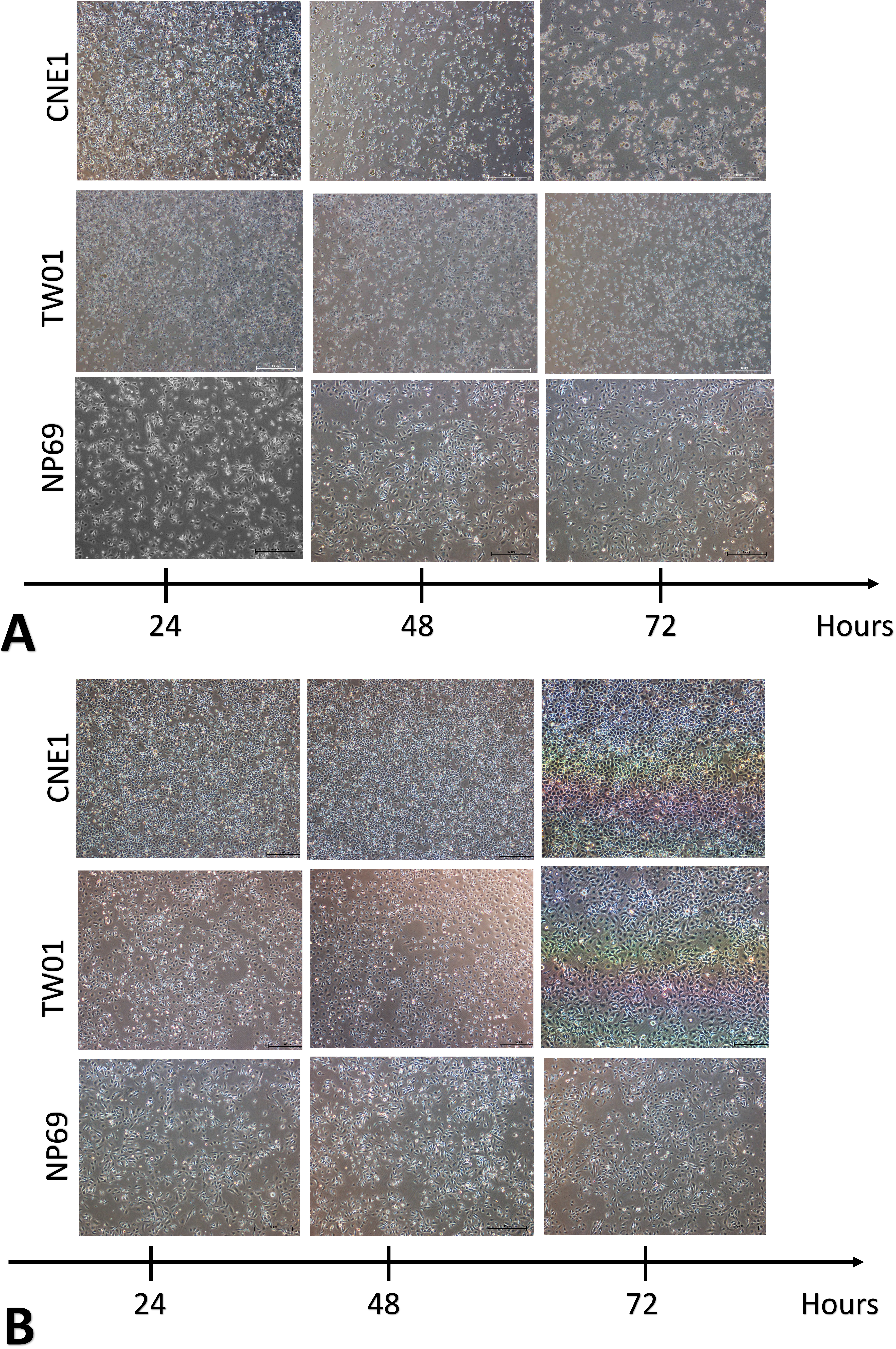 Fig. 2.Microscopy observation of (A) PRV7S and (B) mock infected CNE1, TW01 and NP69 at MOI 0.1 for 24 h, 48 h and 72 h.