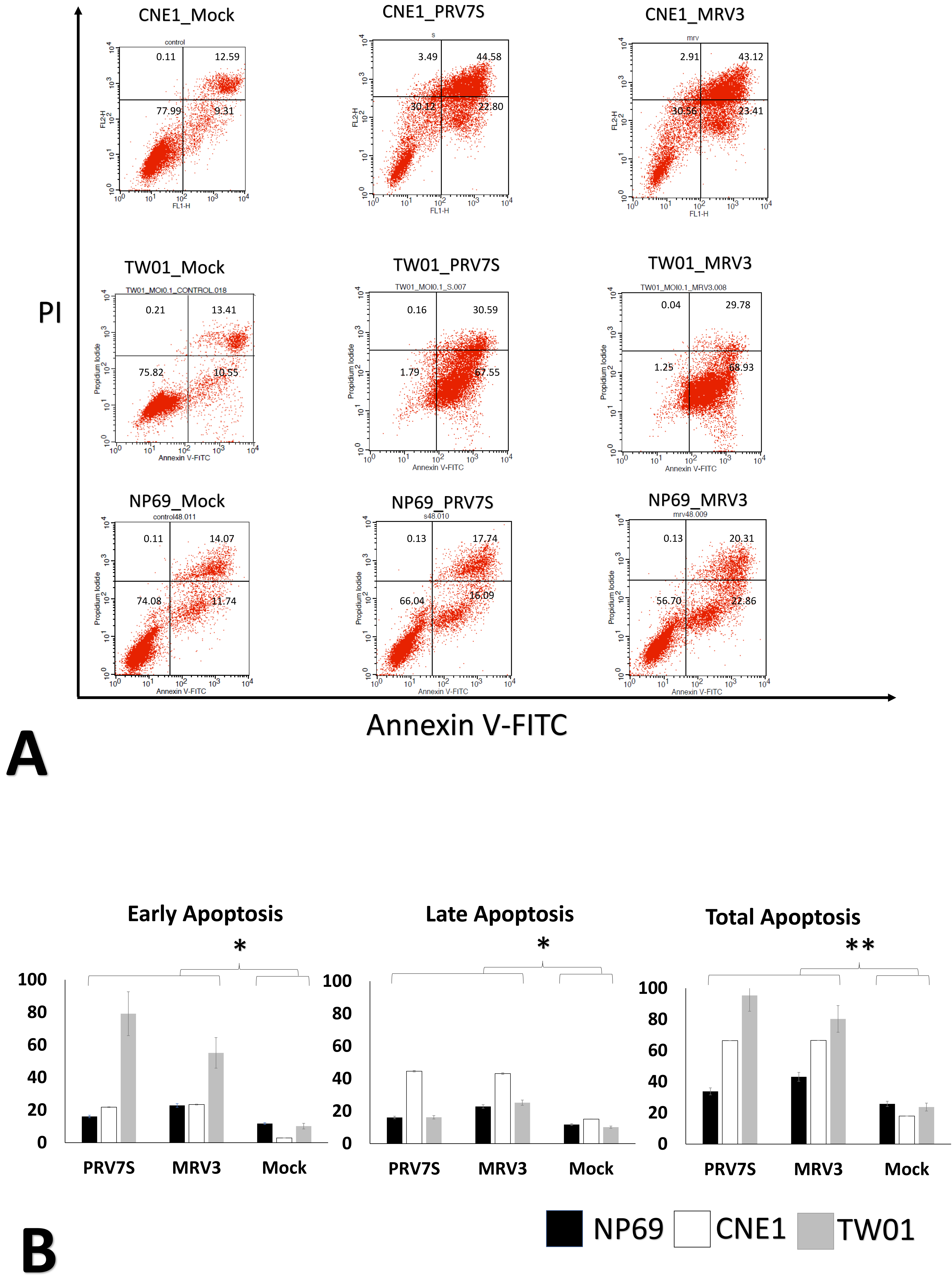 Cytopathic effect was observed in the PRV7S- and MRV3-infected NPC cells. Besides that, multinucleated cell formation was observed from the PRV7S-infected NPC cells as hallmark of fusogenic virus infection. However, syncytia formation was not found. Hence, it is hypothesized that despite reducing cell proliferation, PRV7S could analogously induced apoptosis towards NPC cells as per MRV3 [23, 24]. Flow cytometry results revealed that both PRV7S-infected and MRV3-infected NPC cells (CNE1, TWO1) showed increased positive signals for late and early apoptosis compared to the mock infection group. Significantly lower percentage of apoptotic cells population were observed in PRV7S-infected and MRV3-infected NP69 cells. Taken together, PRV7S was able to induce apoptosis in infected NPC cells. Besides, both PRV7S-infected and MRV3-infected NPC cells, CNE-1 and TW01 respectively displayed difference in apoptosis proportion with CNE1 having more late apoptosis population, while TW01 having more early apoptosis population. Necrotic populations are not included as the study focus on investigating the late and early apoptotic populations of NPC and NCNP. These findings further emphasize that PRV7S demonstrated direct oncolytic features similar to MRV3, albeit that the MRV3 strain utilized in this study is not Reolysin strain.