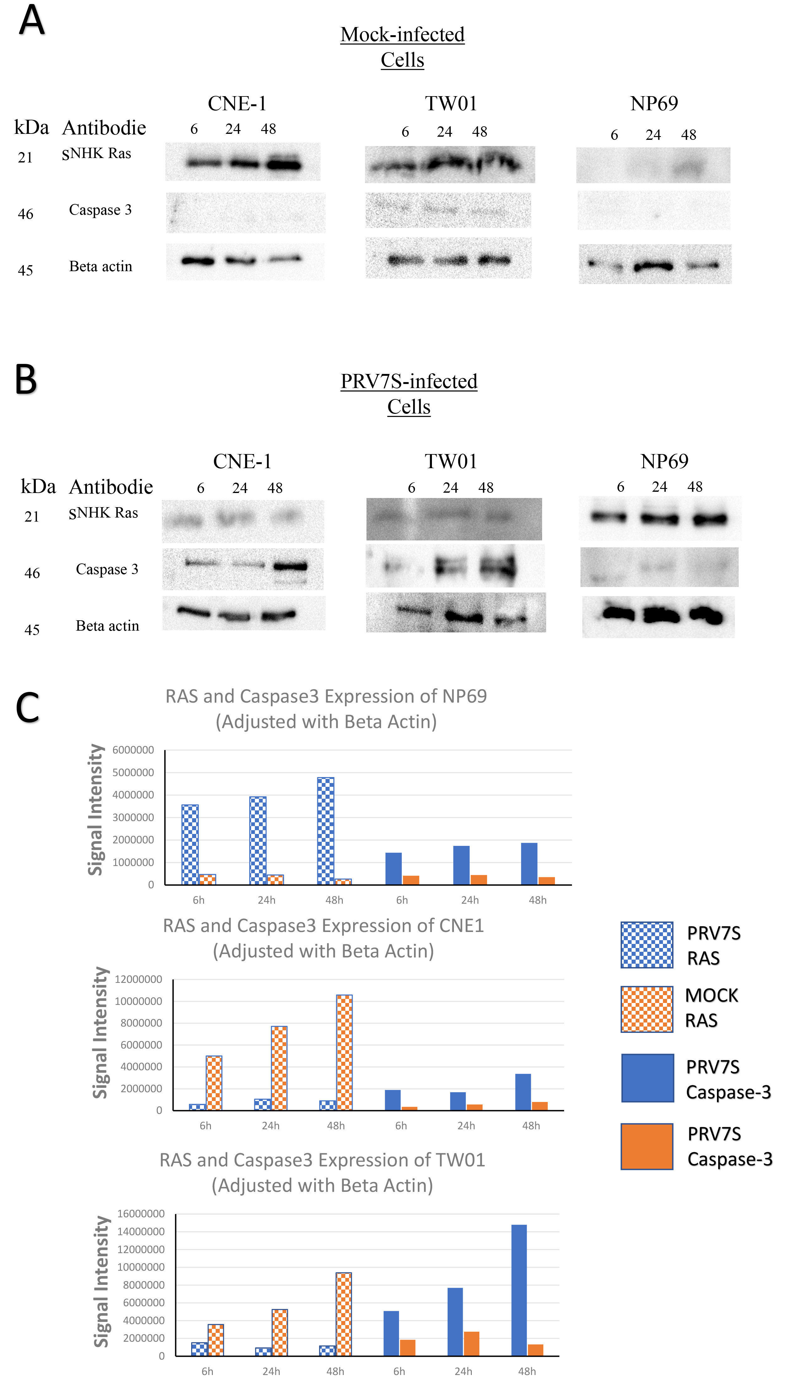 Expression of N/H/K RAS proteins were downregulated after infection of PRV7S in NPC (CNE1 and TWO1) cells. PRV7S-infected NP69 cells shown expression on N/H/K RAS protein suggesting that RAS transformation occurs despite no observation of cell deaths within 48 hpi. Nevertheless, we observed that PRV7S-infected-NP69 cells experienced senescence and unable to multiply after 14 days pi.