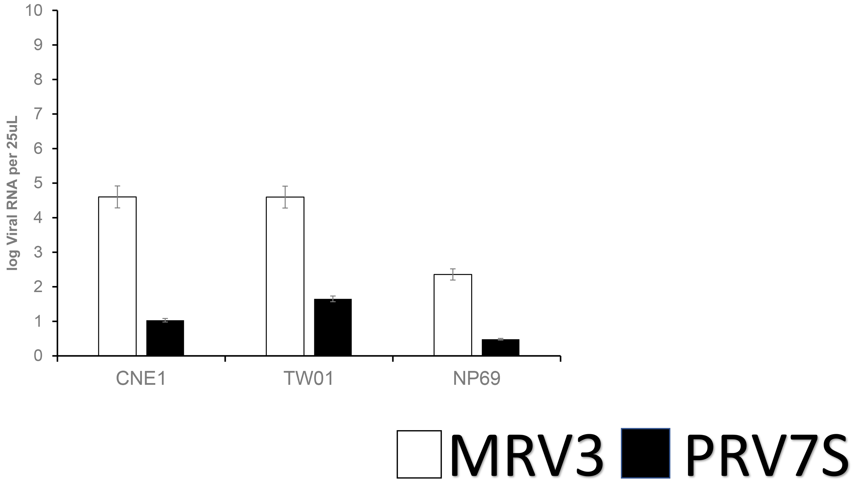 The qPCR assay showed that both PRV7S and MRV3 are able to infected both NPC (CNE1 and TWO1) cells and NP69 cells (Fig. 5). It was observed that PRV7S- and MVR3-infected CNE1 and TW01 cells had higher viral RNA load than infected NP69 cell.