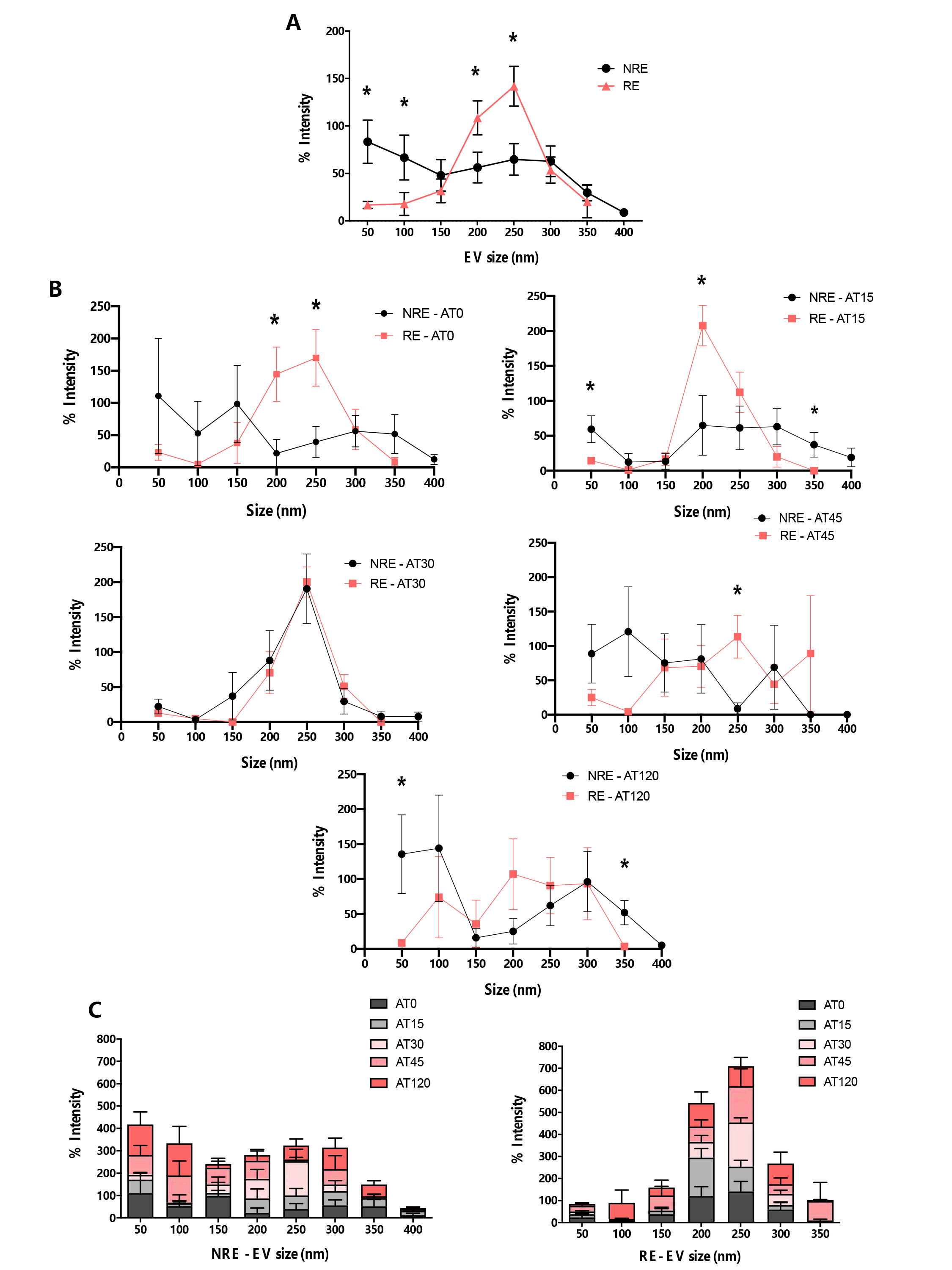 time 0 (AT0), during (AT15, 30 and 45) and after recovery (AT120). EVs from