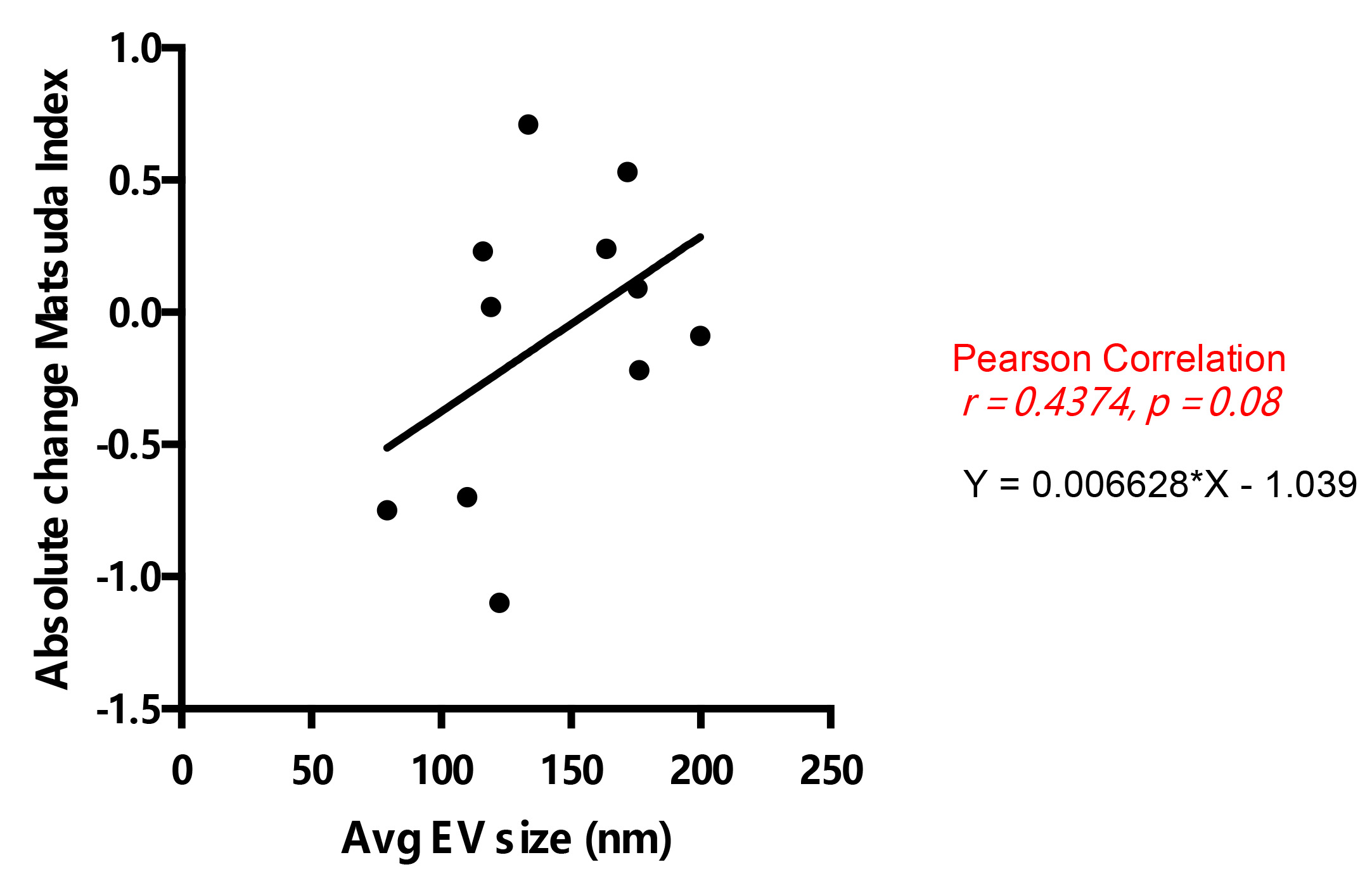 Fig. 4.Association of average EV size with absolute change in Matsuda Index. Pearson’s Correlation analysis showed a moderate positive association between average EV size and absolute change in Matsuda index (indicative of insulin sensitivity) post 6-week resistance exercise training (r = 0.4374, p = 0.08).