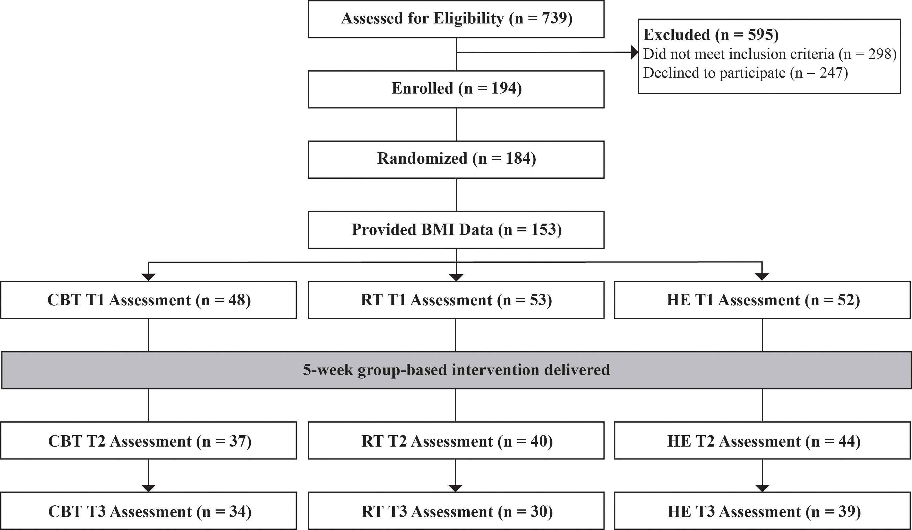 post-randomization, we tested a two condition (CBT/RT vs HE) by two group (OW/OB