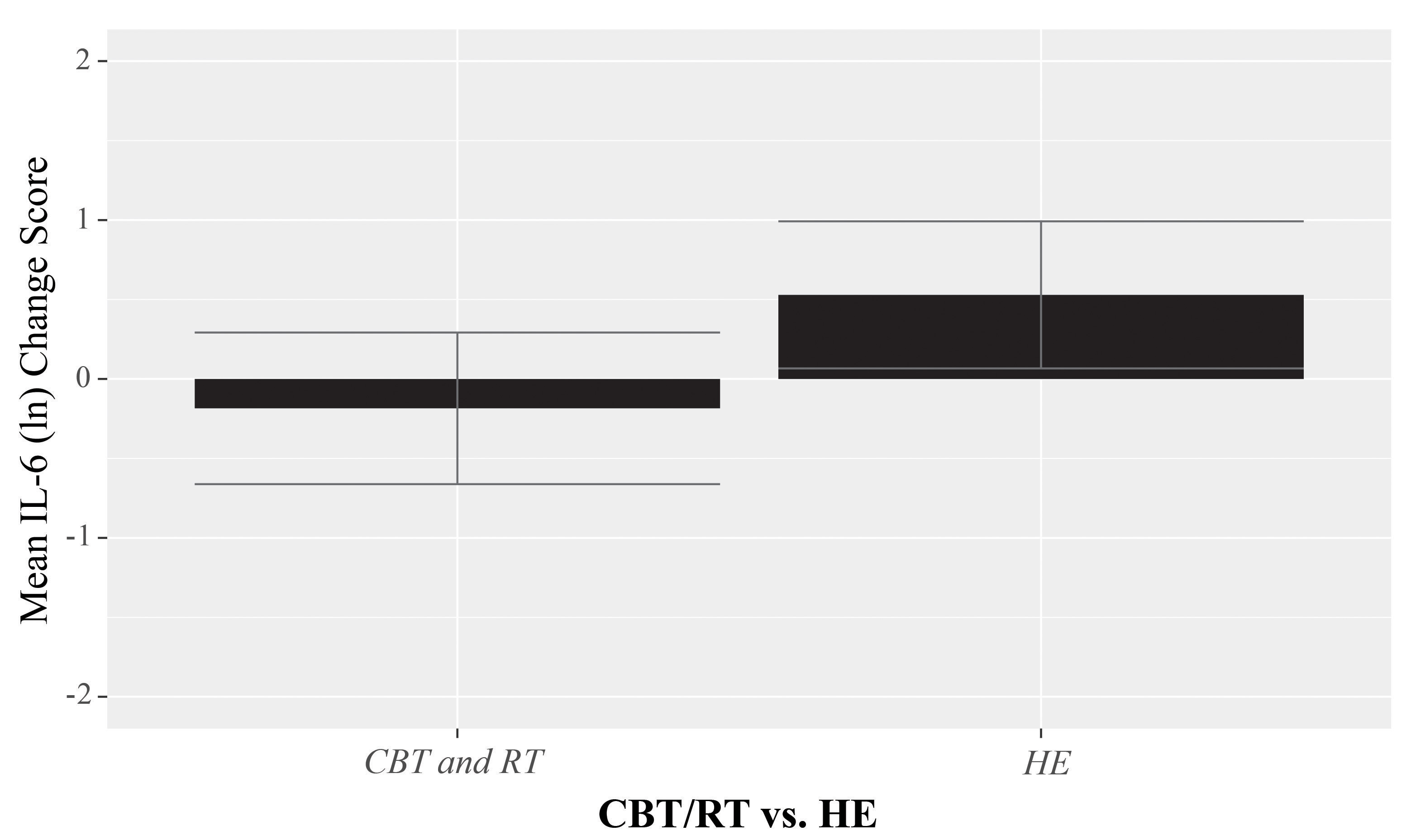 Fig. 3.Change in IL-6 pre- to 6-months post-intervention by study condition (CBT/RT vs HE) among overweight and obese women with breast cancer combined. Cytokine levels are log-transformed to achieve normality. Error bars represent 95% confidence intervals. RMANOVA indicated that overweight/obese women receiving CBT/RT had significantly decreased IL-6 levels over time vs those who received HE (F(1,45) = 4.24, p = 0.045).