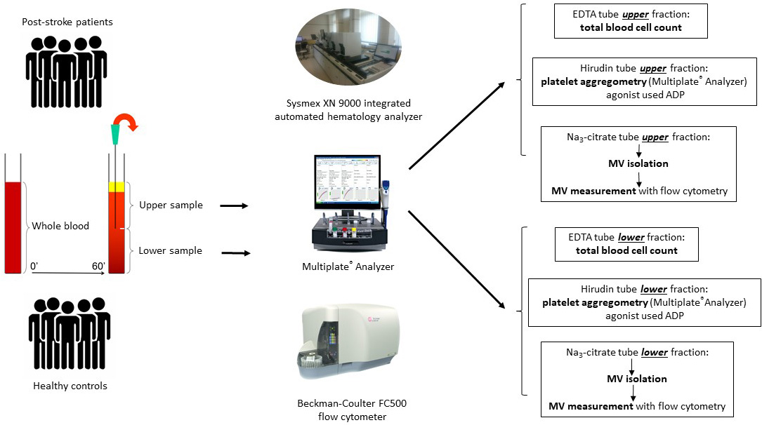 The aim of this prospective pilot-study was to explore: (i) differences of circulating MVs of different origin, comparing convalescent ischemic stroke patients vs healthy controls; (ii) whether the function of platelets correlate with certain MVs in patients on antiplatelet (clopidogrel) therapy; (iii) which PMVs show association with the high-on-treatment residual platelet reactivity (non-responder state).