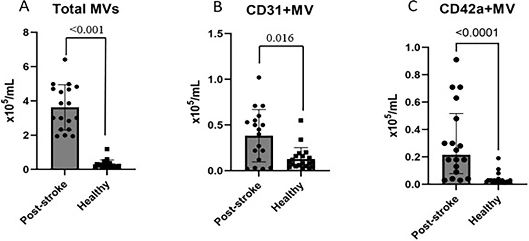 and the total number of MVs in the whole blood of post-stroke patients, we
